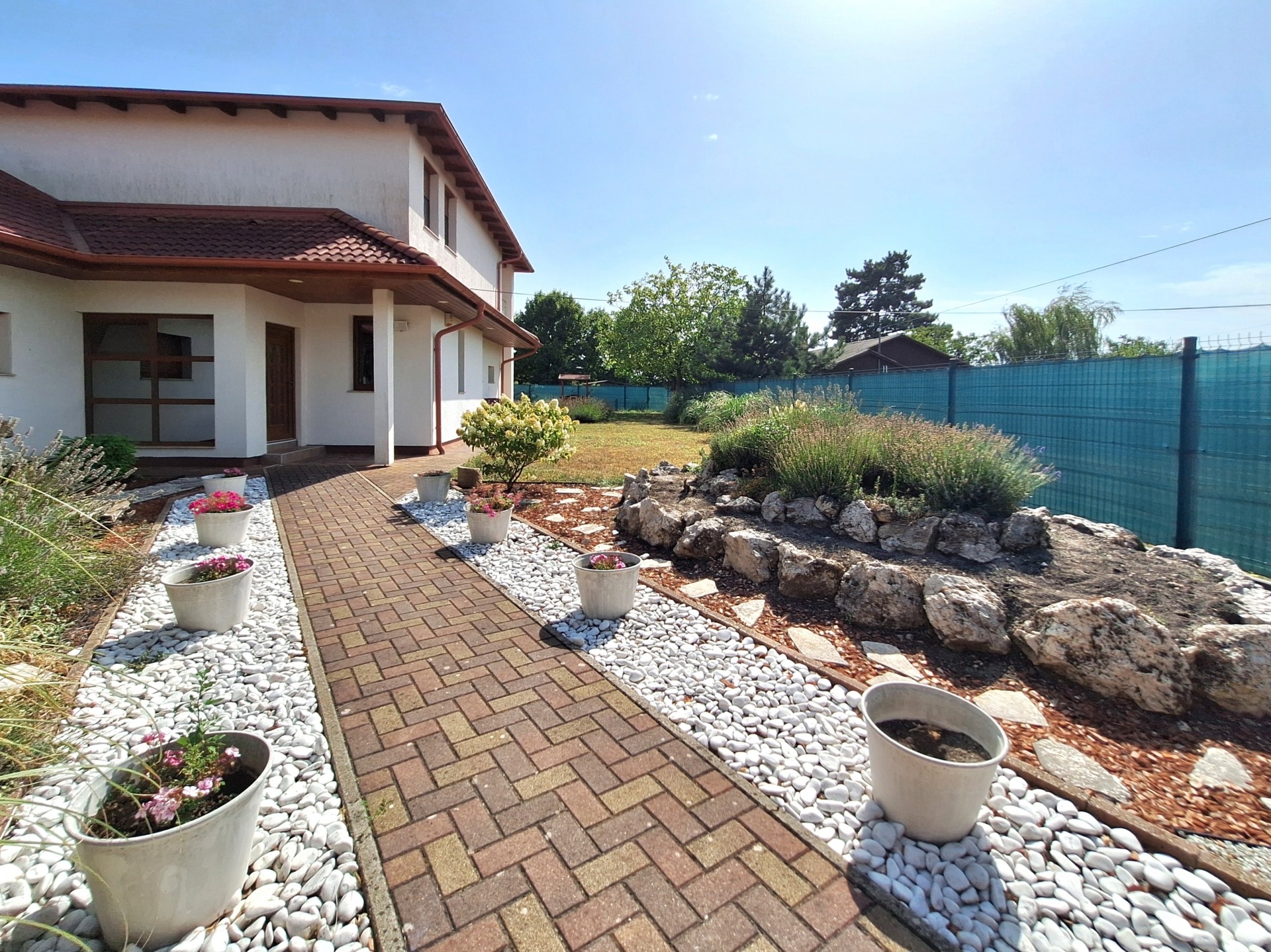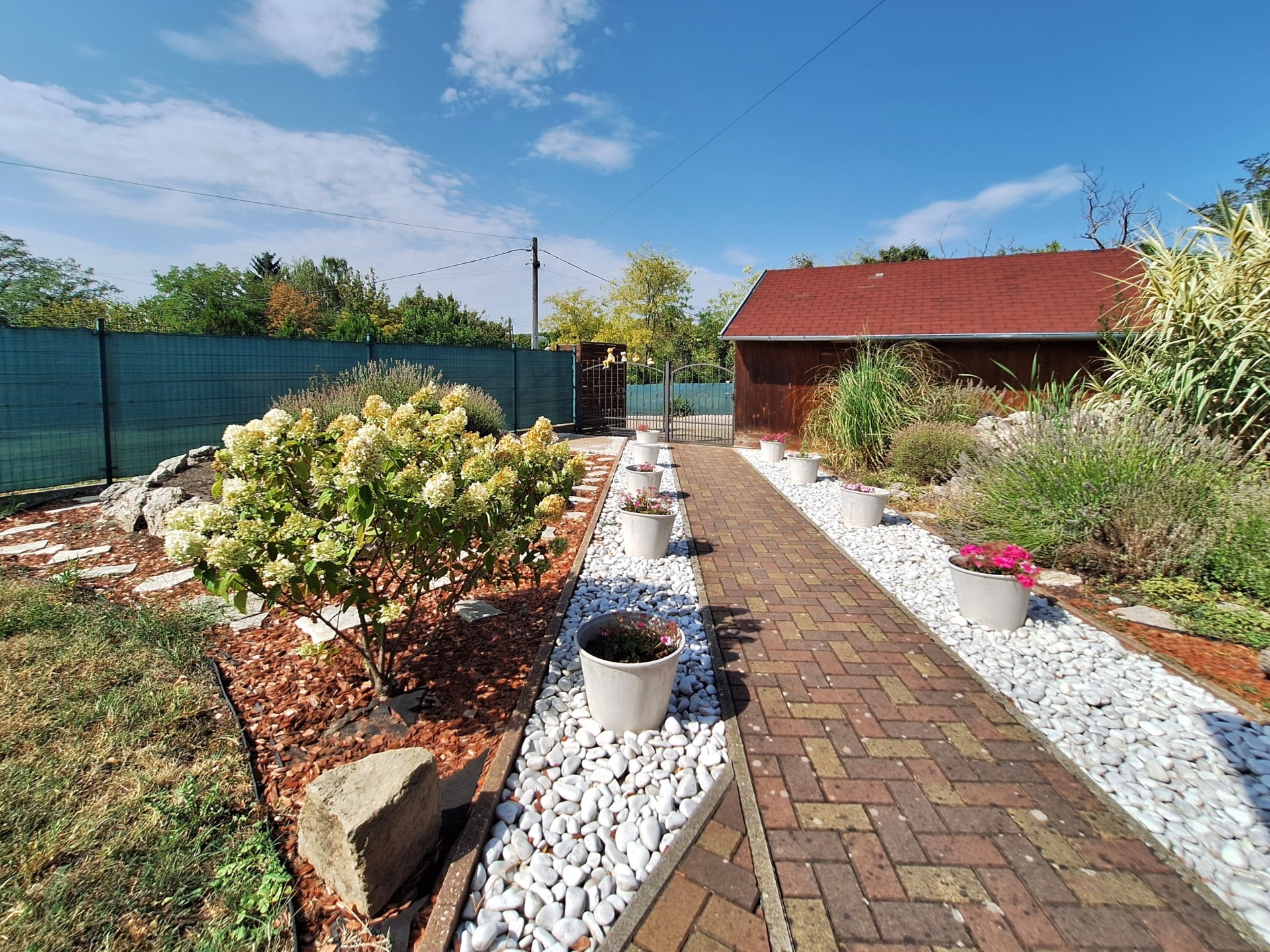 The garden is decorated with beautiful evergreens and flowers, with an additional small pond.