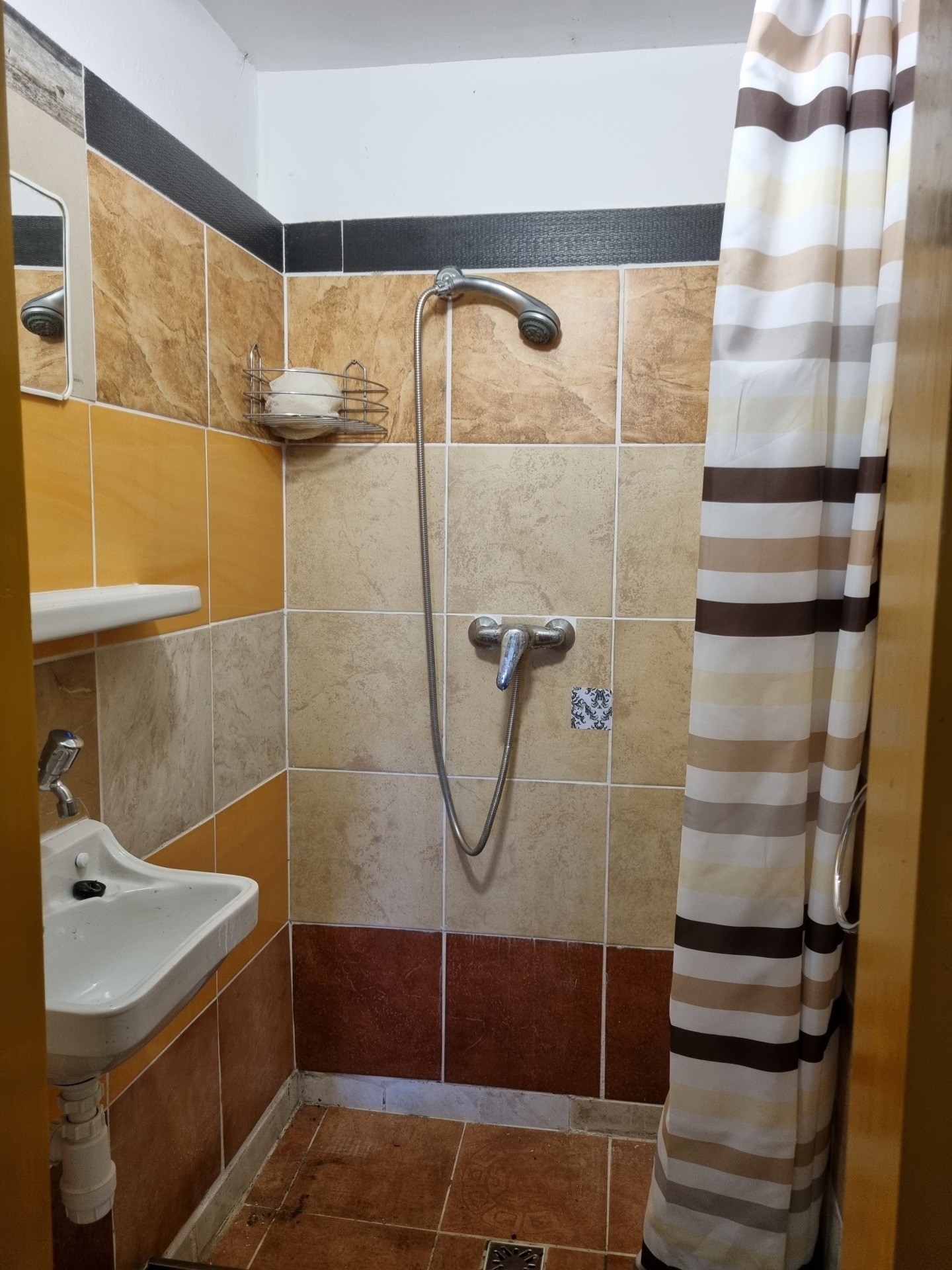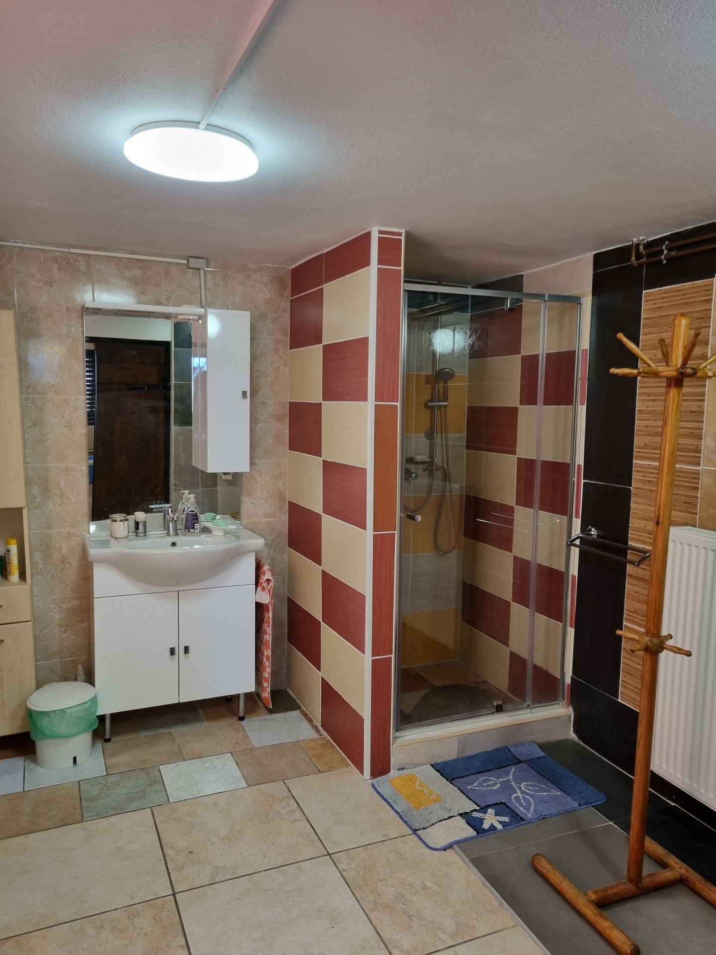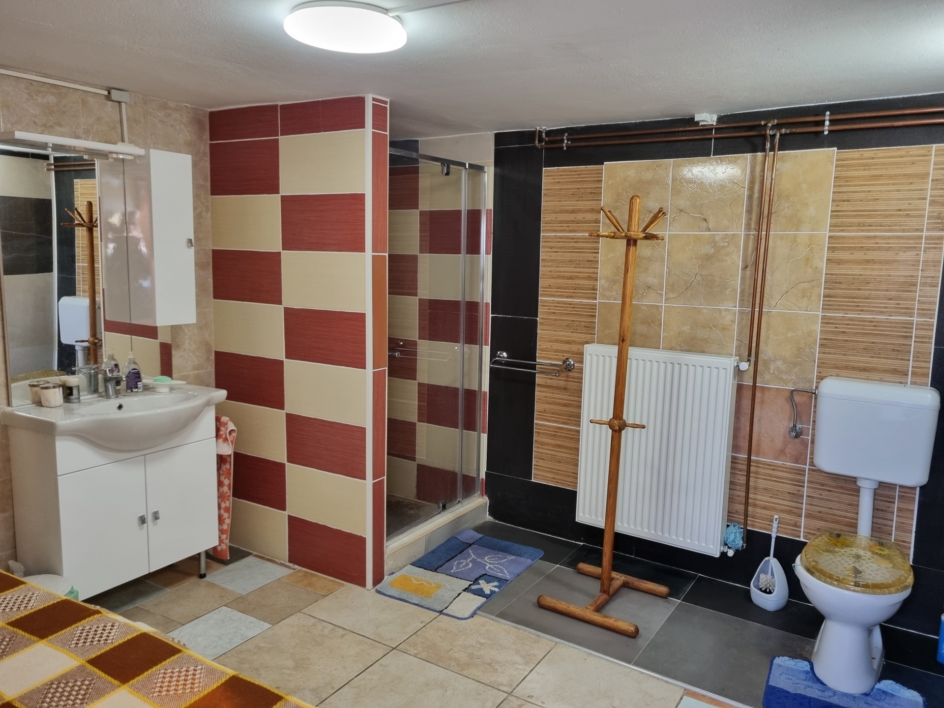 Fürdő + WC egyben, zuhanyzóval, átfolyós csapteleppel