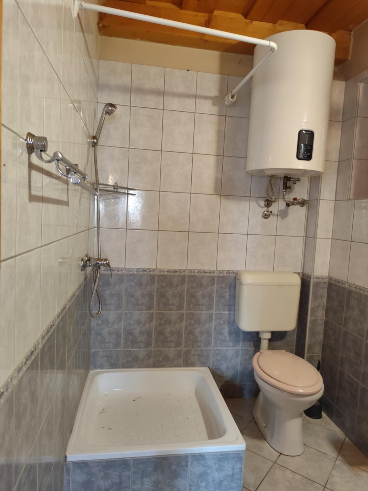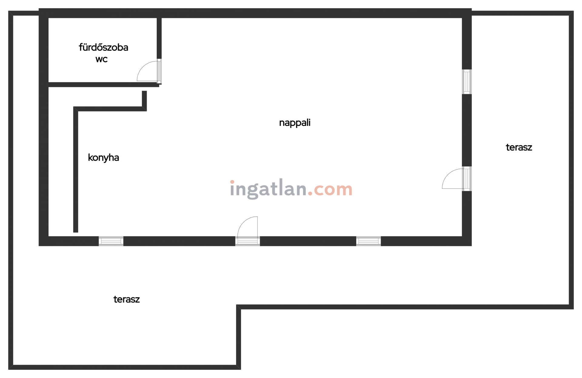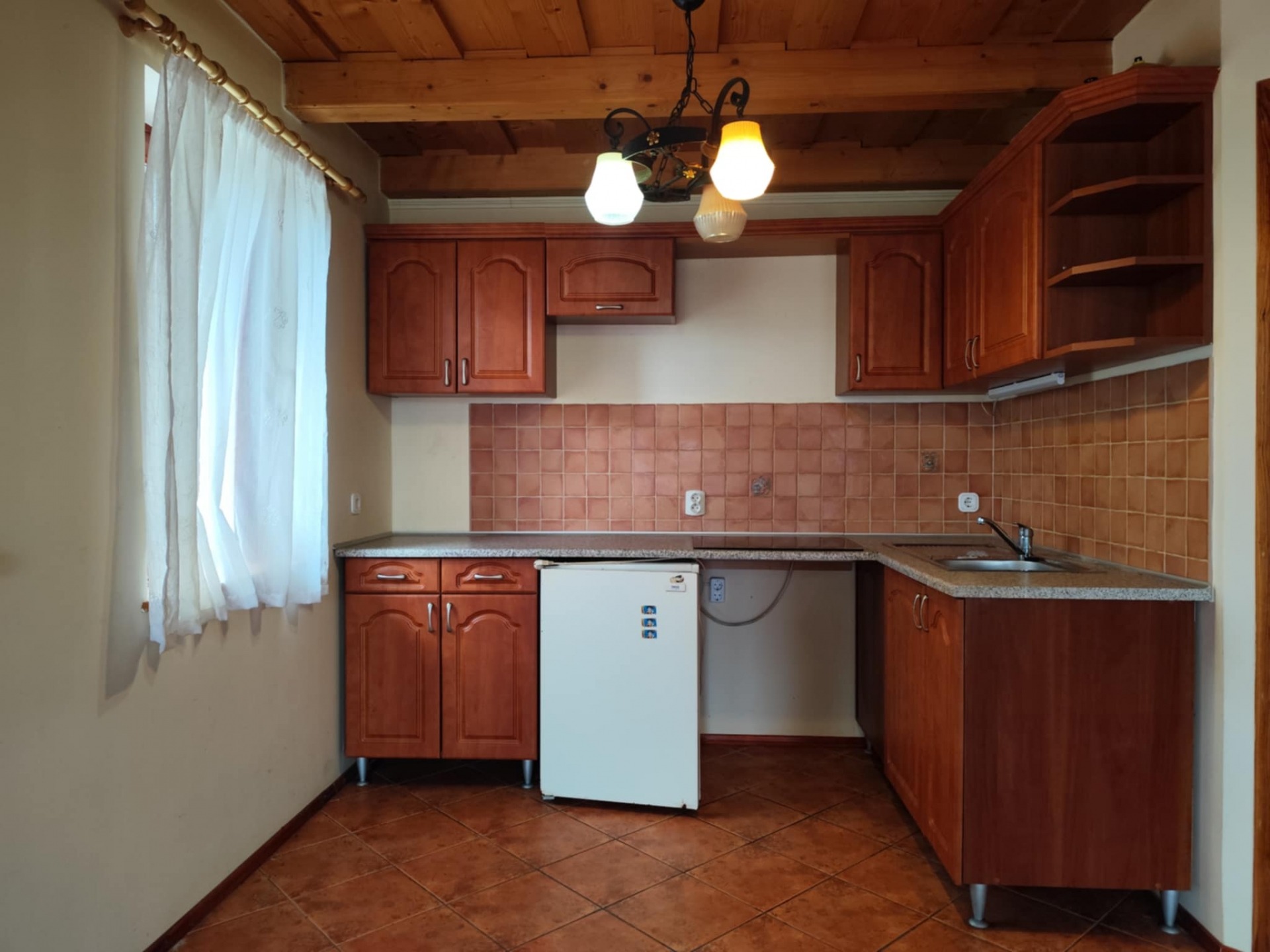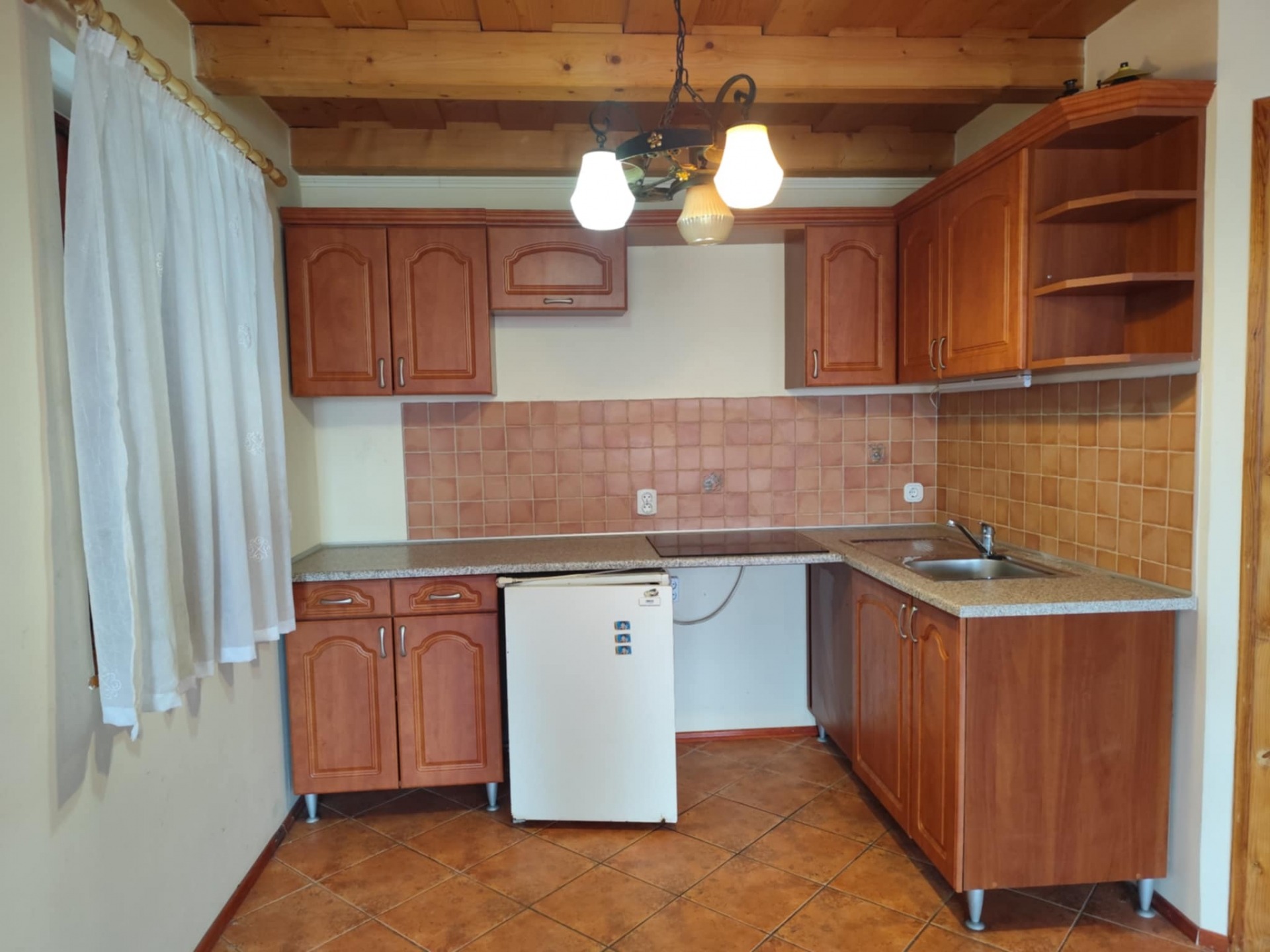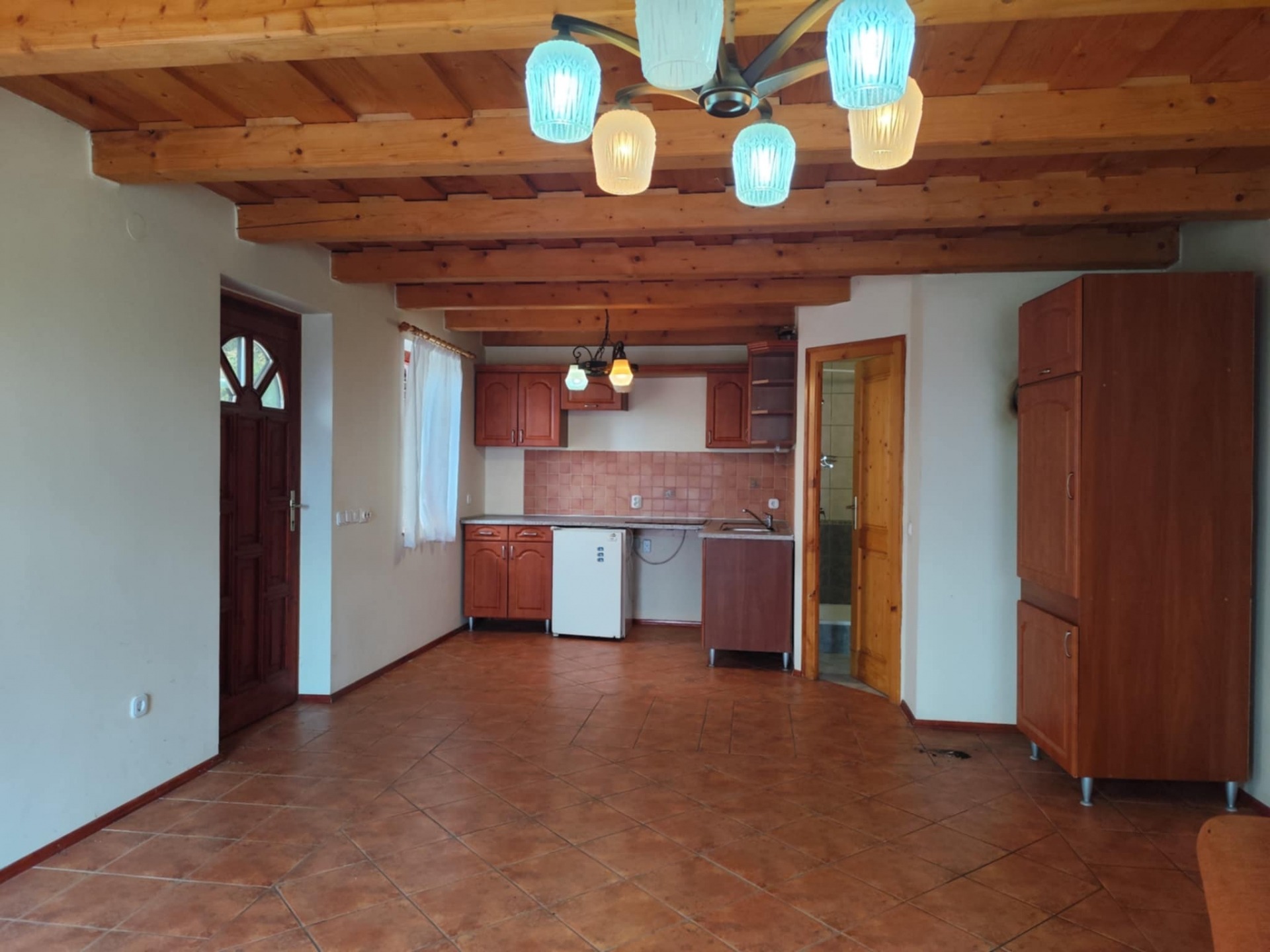Az épületet "L" alakban hatalmas terasz öleli körül, ahonnan csodálatos panoráma tárul elénk. Belépve egy légtérben találjuk a nappalit és a konyhát (30 nm). Ezenkívül egy fürdőszoba található még WC-vel. A tetőtér üres, de beépíthető.