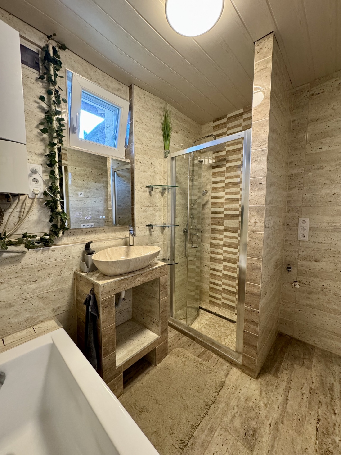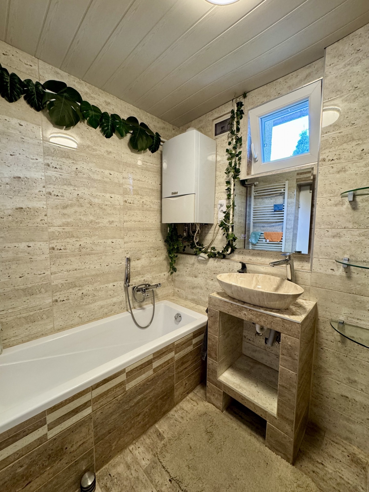 3 fűtési rendszer áll rendelkezésre. Gáz-cirkó kazán radiátorokra csatlakoztatva, 2 cserépkályha, 2 helyiség infrapanel.