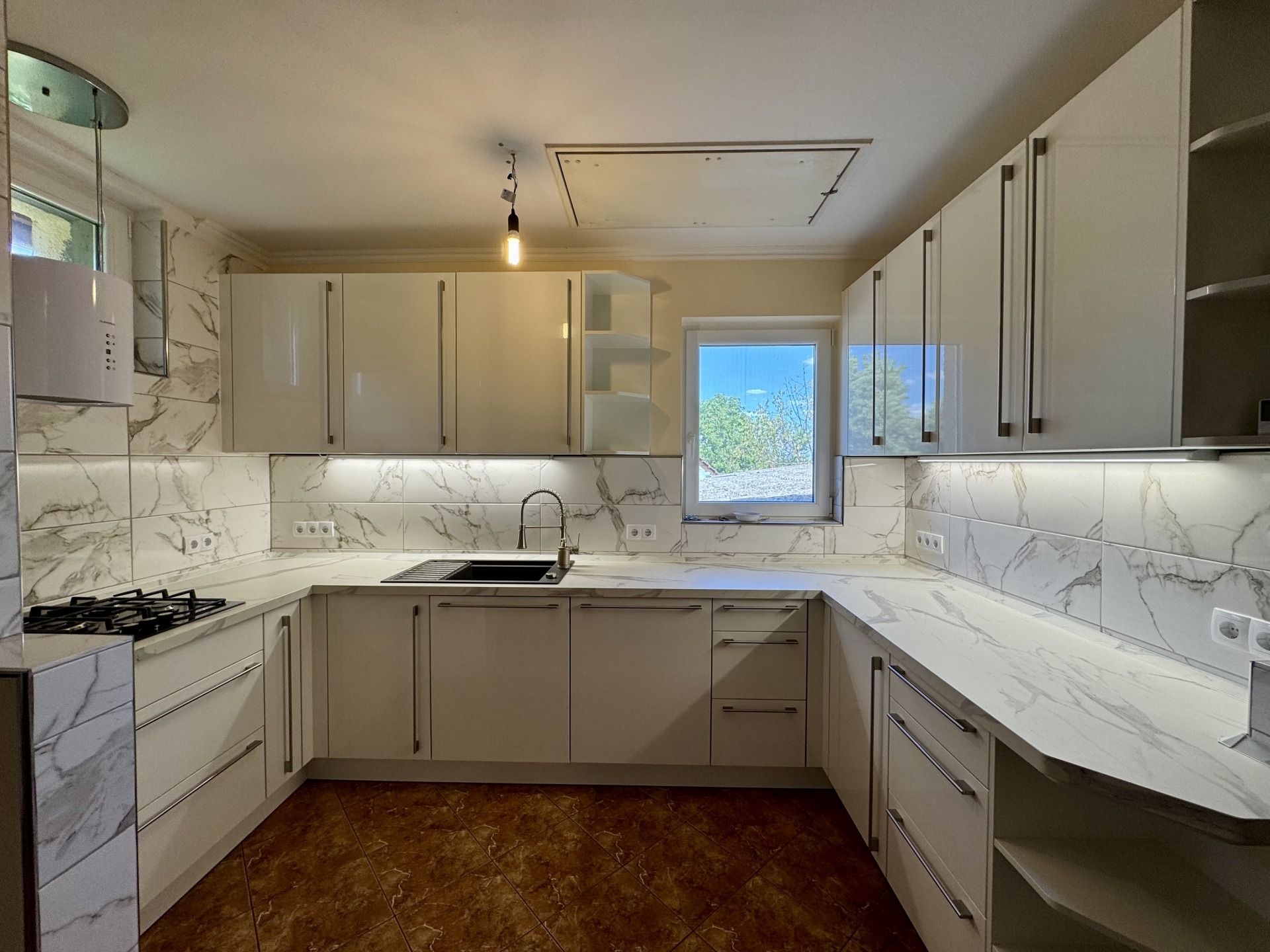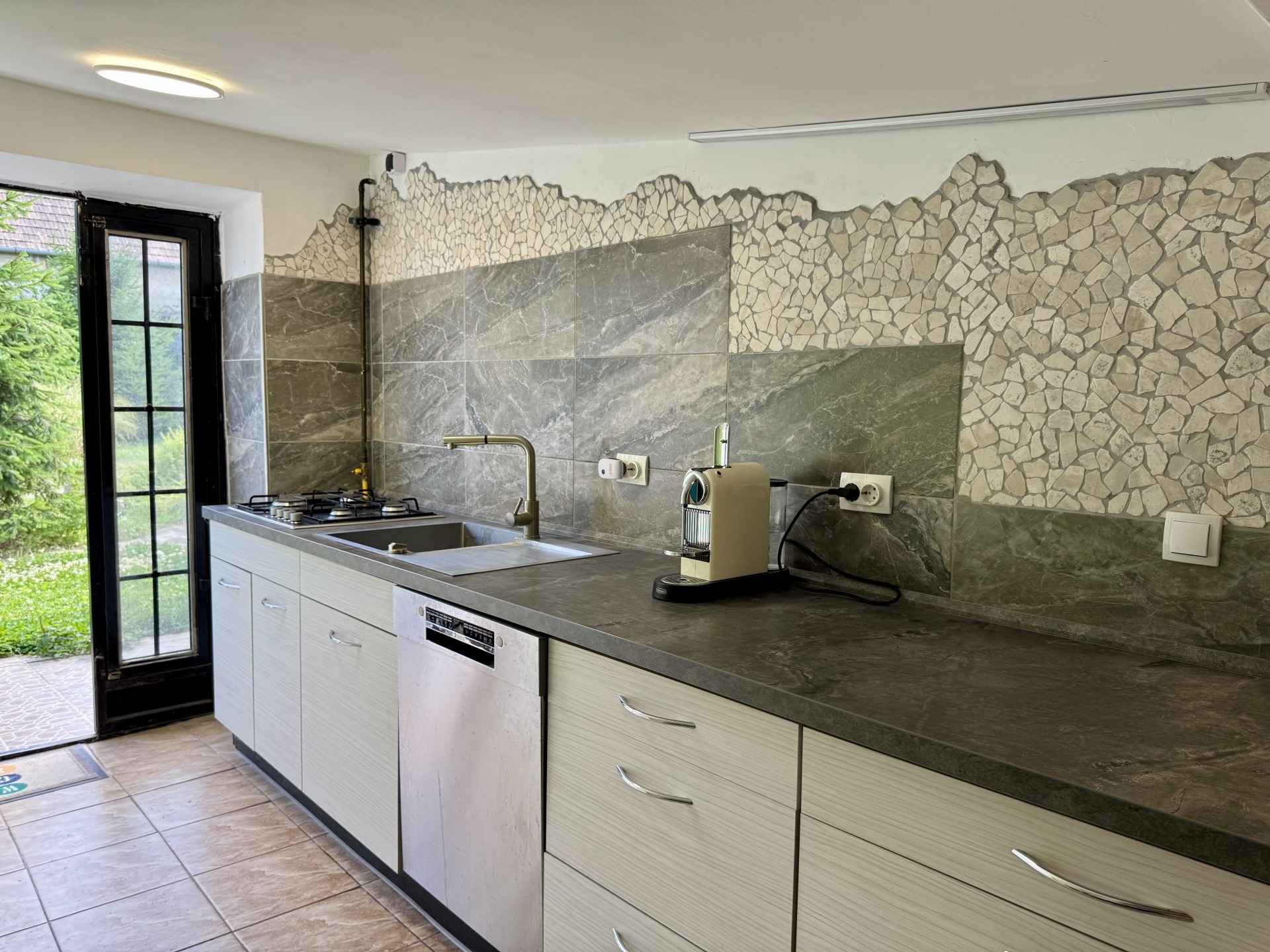 A lakóház folytatásában, külön bejáratú nyári konyha, és dupla állásos garázs kapott helyet.