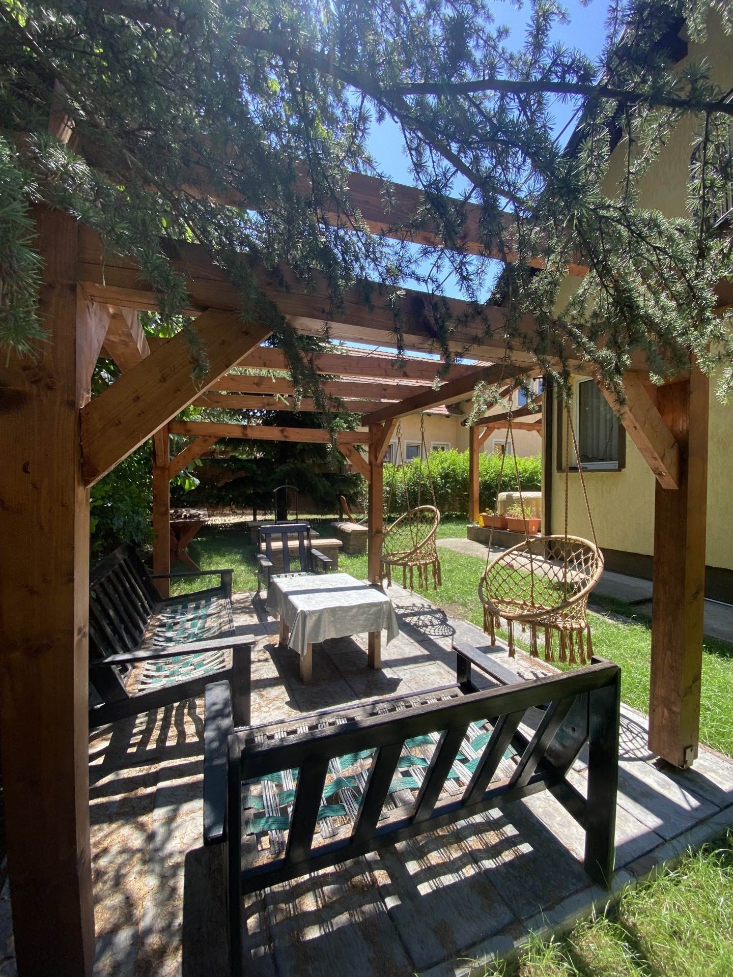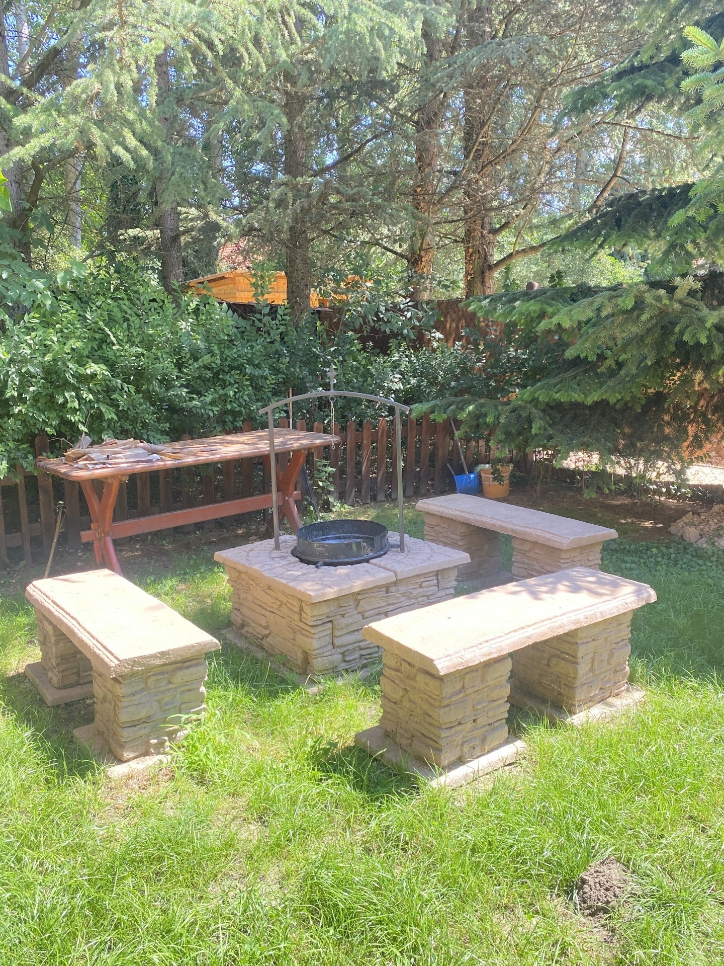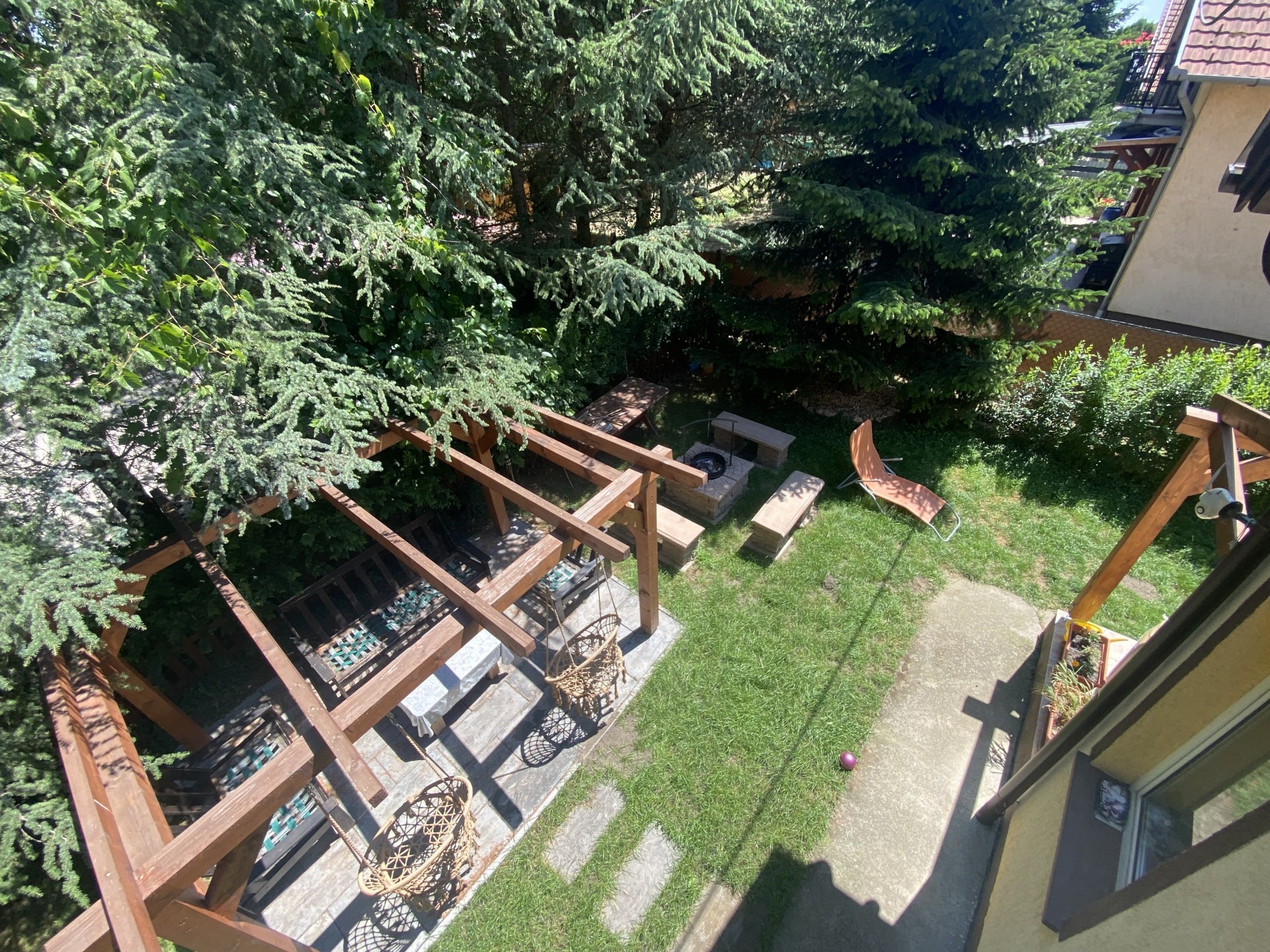 A 760 m²-es kert körbekerített, szabályos alakú, ápolt, fákkal övezett, kiülők és sütögetők kerültek kialakÍtásra. A kert végében háromállásos garázs és tárolók találhatók.
