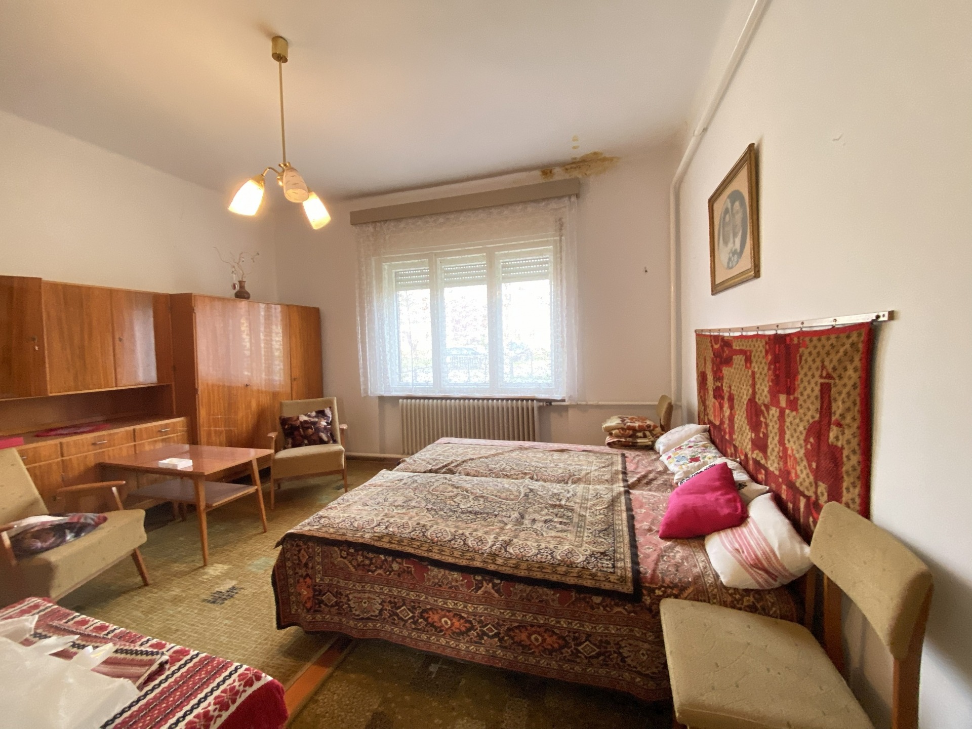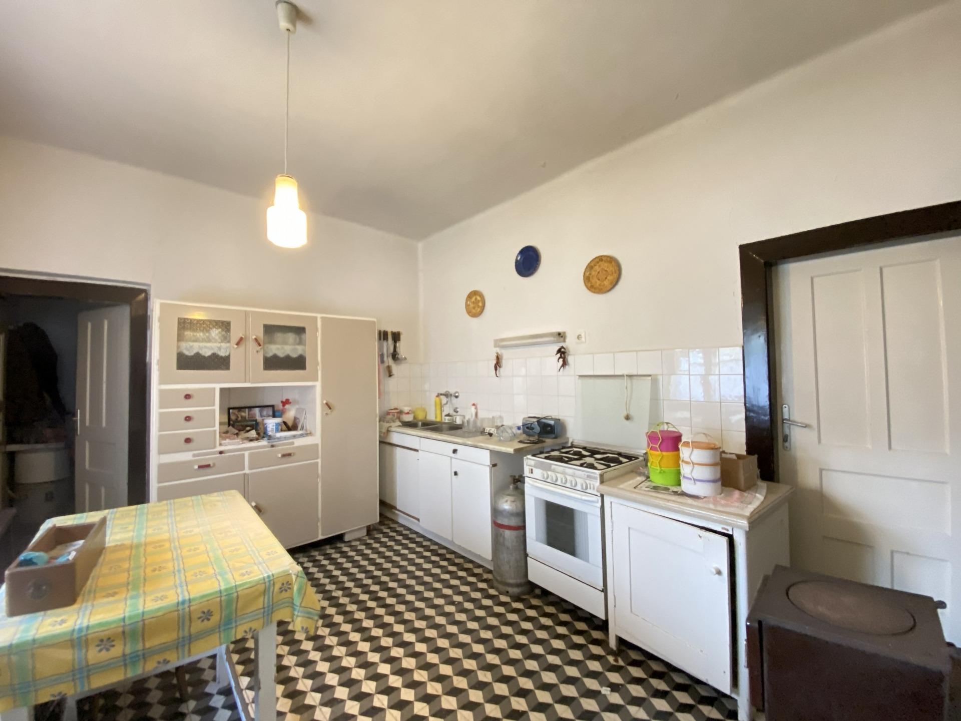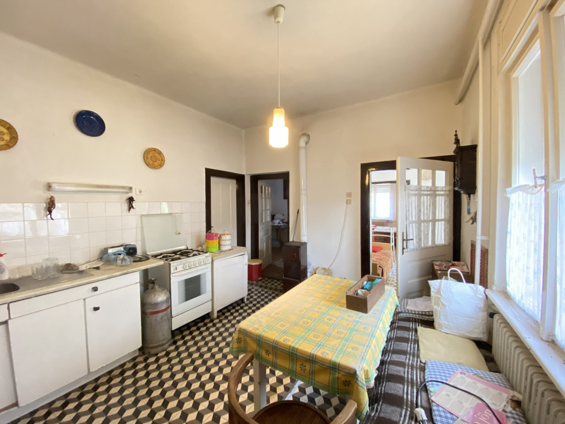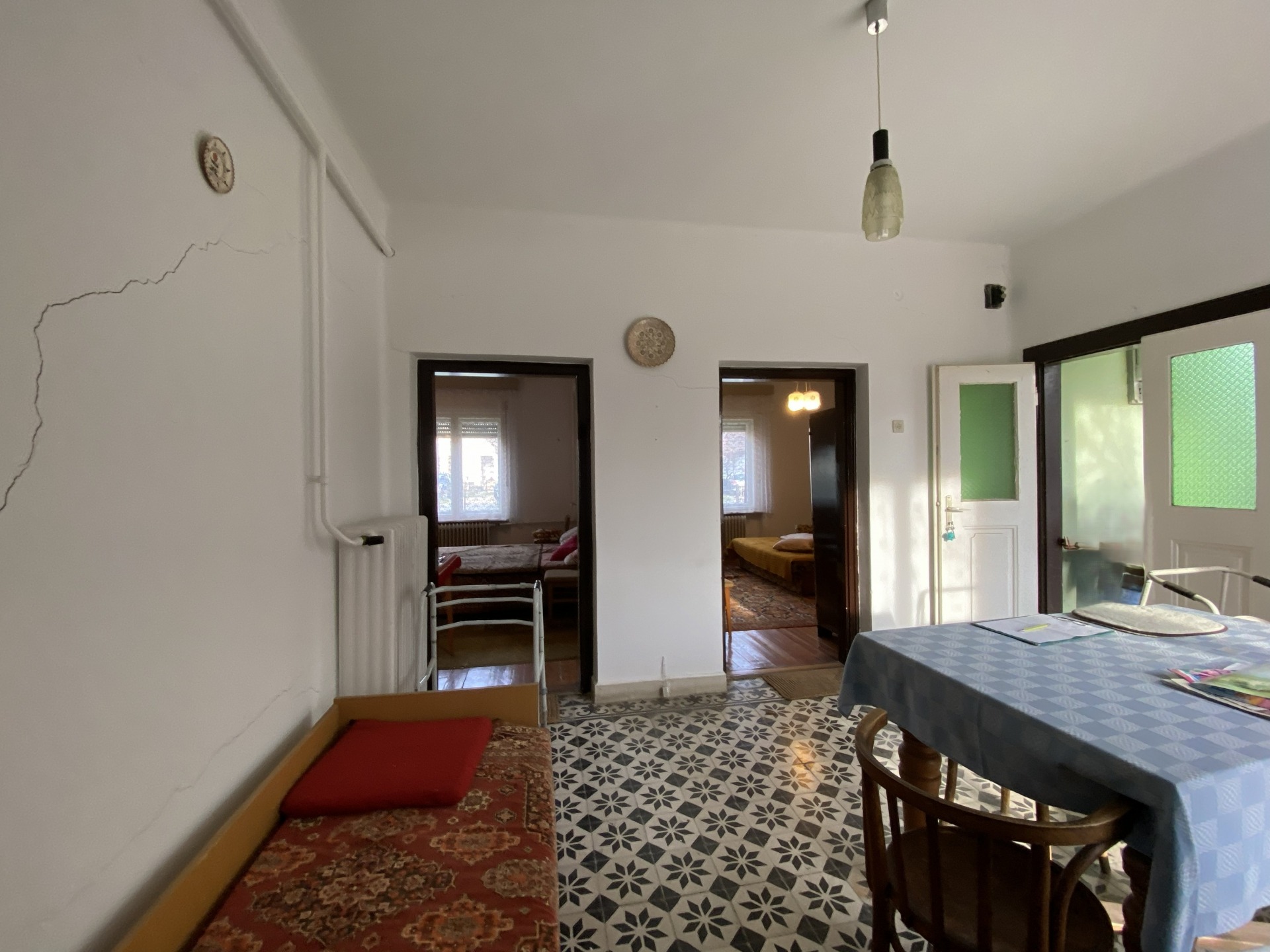 A tágas, világos előtérből két lakószoba, valamint egy szintén nagy és világos konyha nyílik. A konyhából kamra, egy kisebb szoba, illetve egy további helyiség érhető el, ahol a fürdőszoba került kialakításra. Felújítás során a helyiségek funkciója újragondolható és átalakítható.