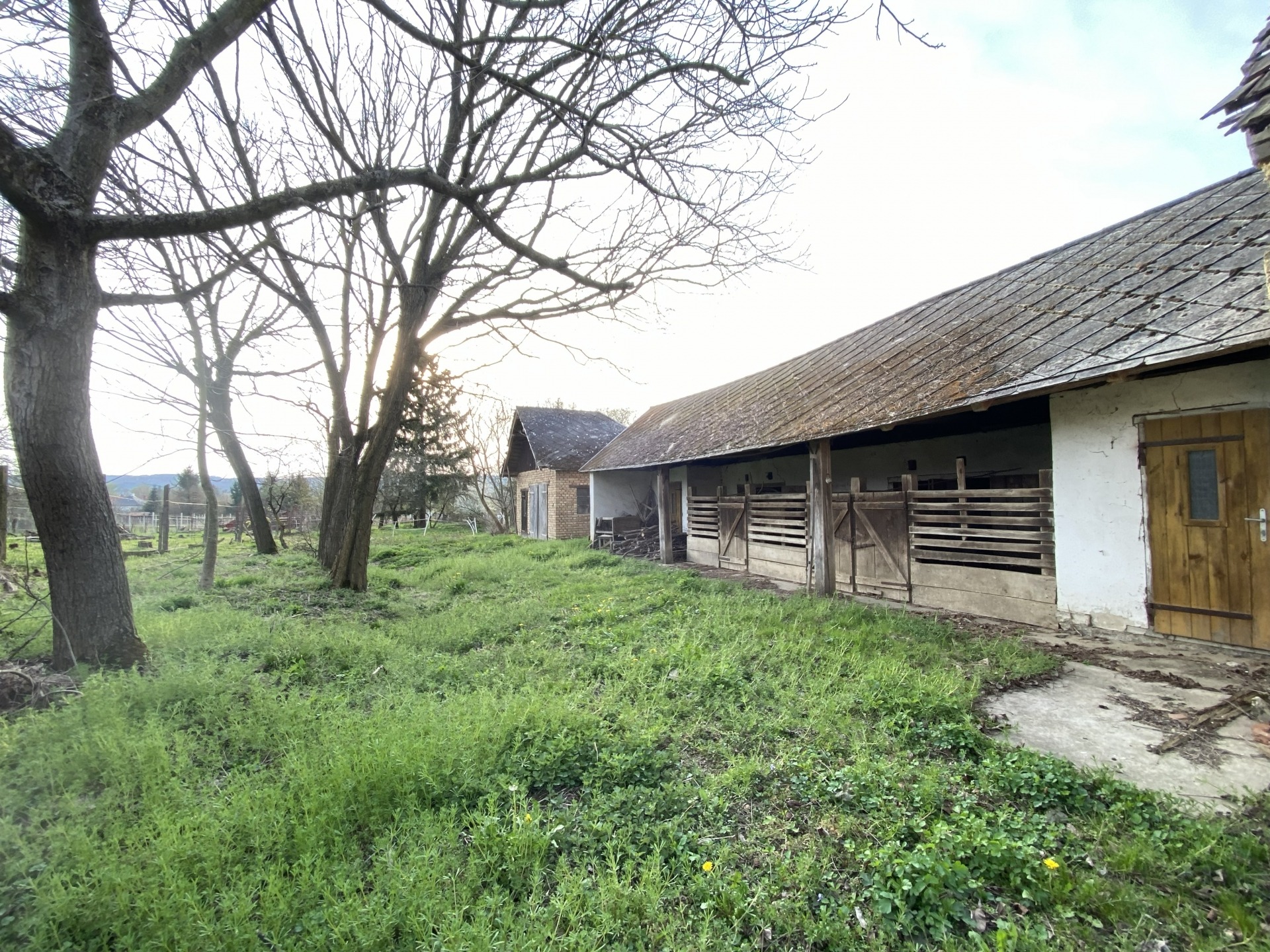 A ház előtt előkert, az épületek mellett gyümölcs- és diófák, a hátsó kertben pedig egy hatalmas fenyőfa található. A közel 6500 m²-es telek igény esetén megosztható, egy része továbbértékesíthető.