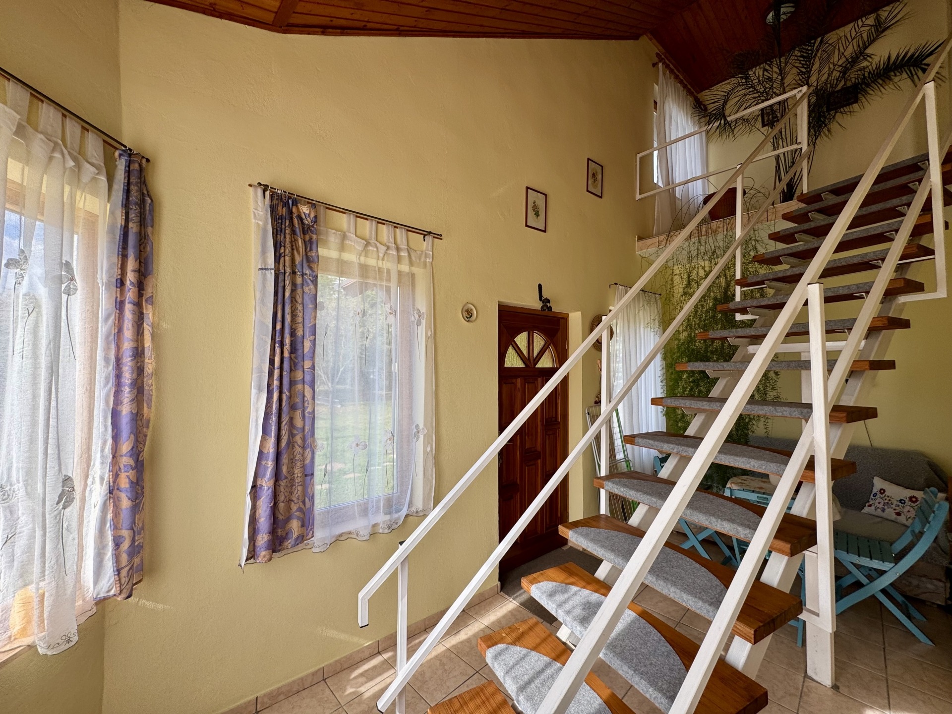 A két életteret lépcsőház köti össze, mely az udvar felől külön bejárattal is használható.
