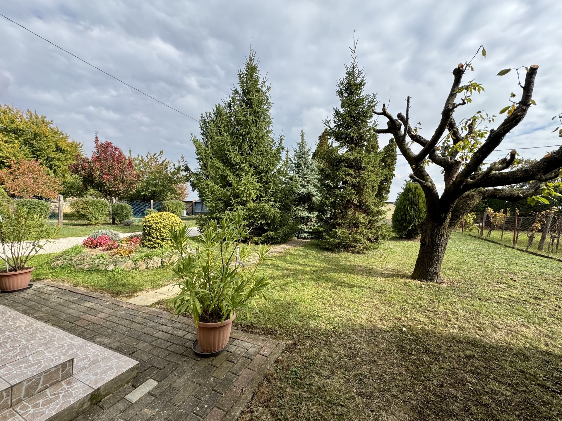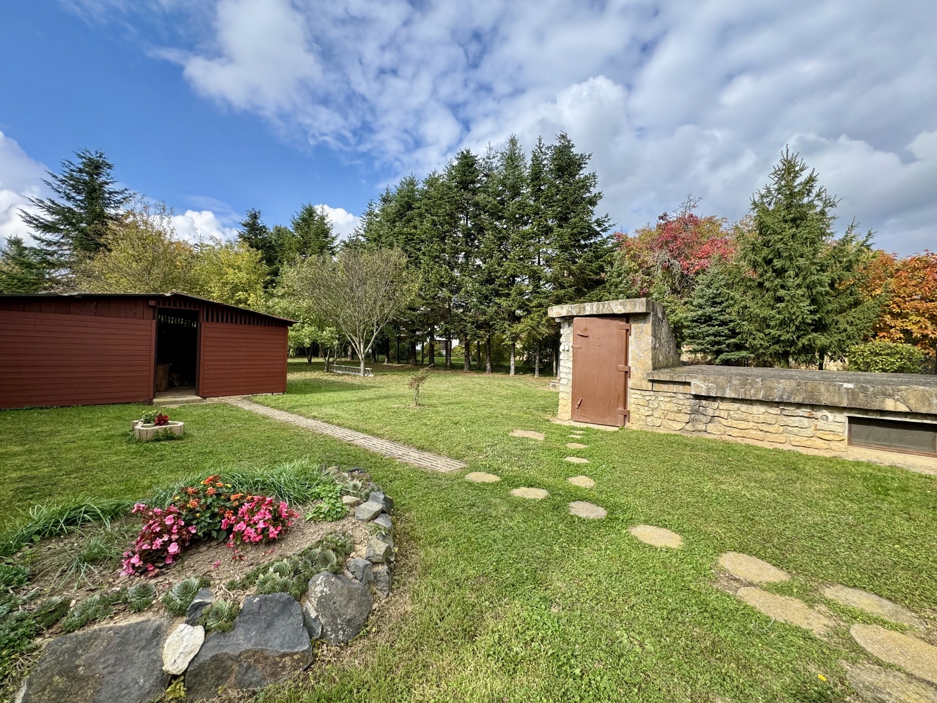 A telken könnyűszerkezetes fatároló és száraz,jól szellőző pince biztosít tárolási lehetőségeket. Az udvarban termő gyümölcsfákat találunk. Előkertje parkosított.