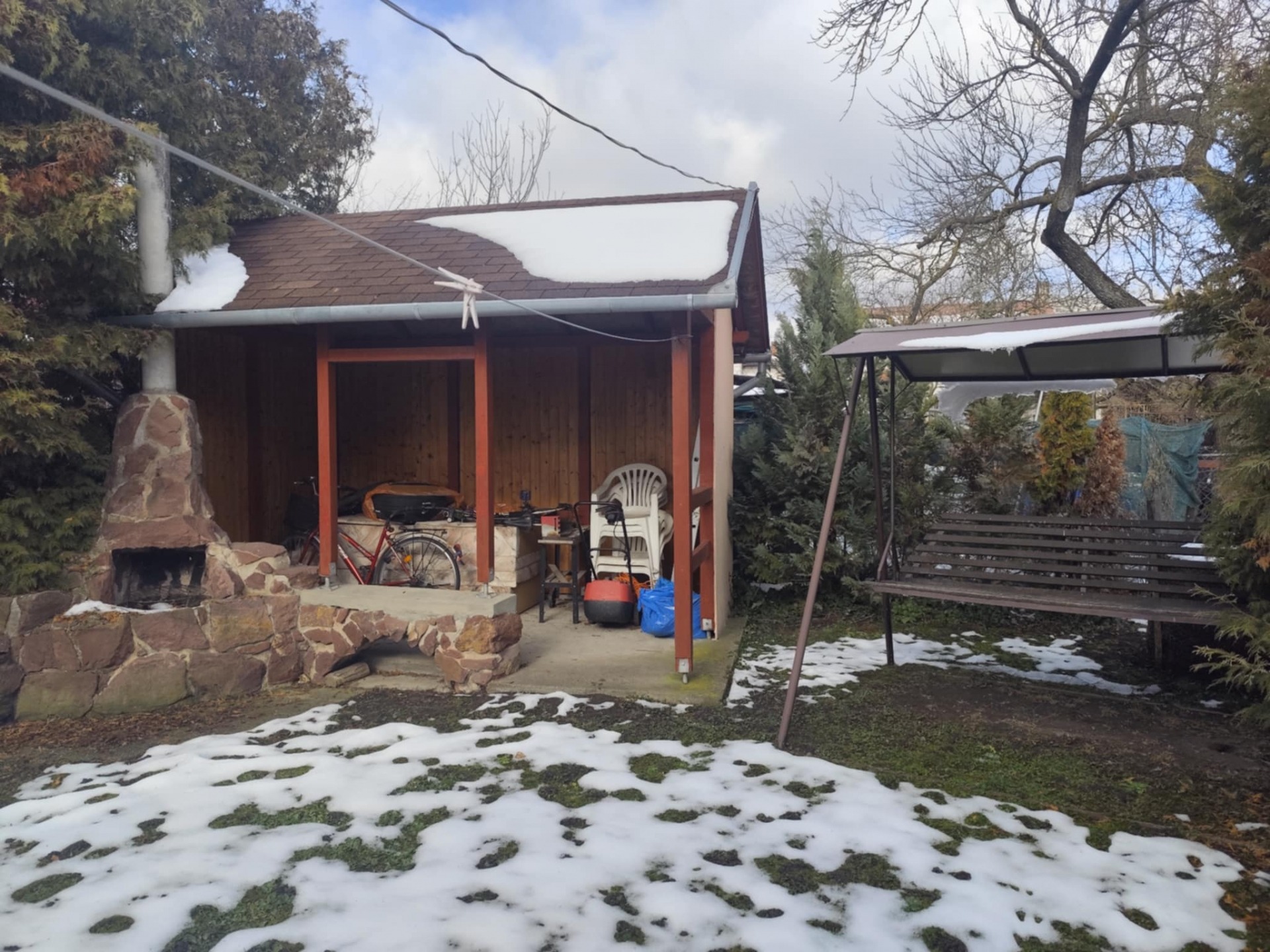 A telek körbekerített, dísznövényekkel beültetett. Hátsó végében egy épített, fedett kerti sütögetőt találunk.