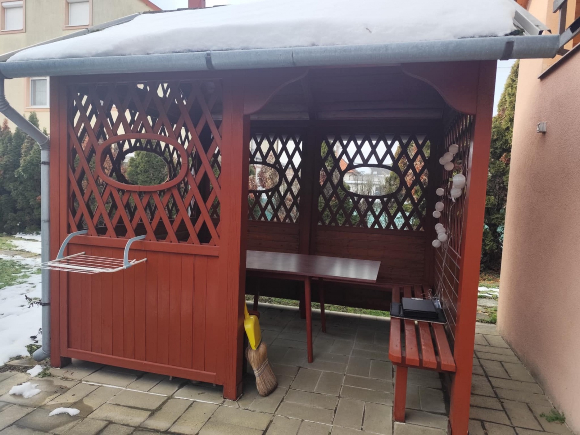 Közvetlen a bejáratok előtt található egy fedett kerti kiülő.