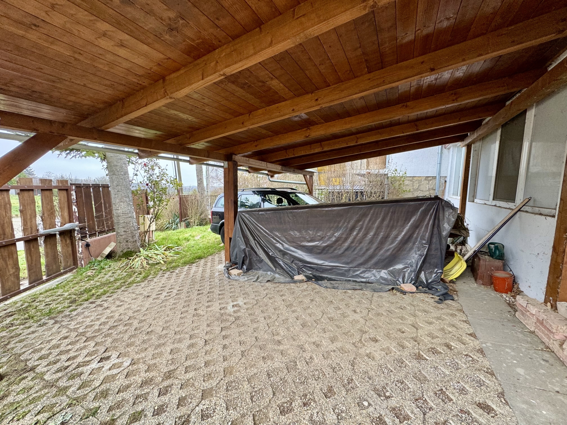 Az épület előtt térkövezett, fedett kocsibeálló lett kialakítva.