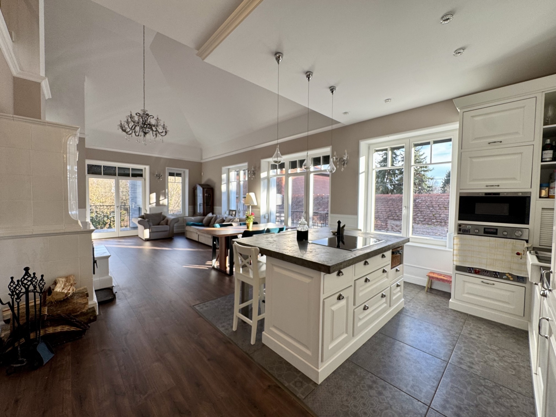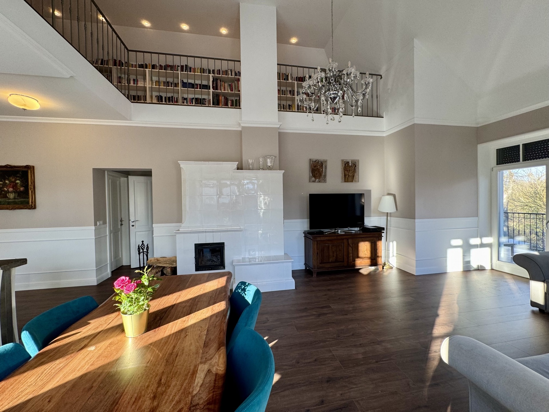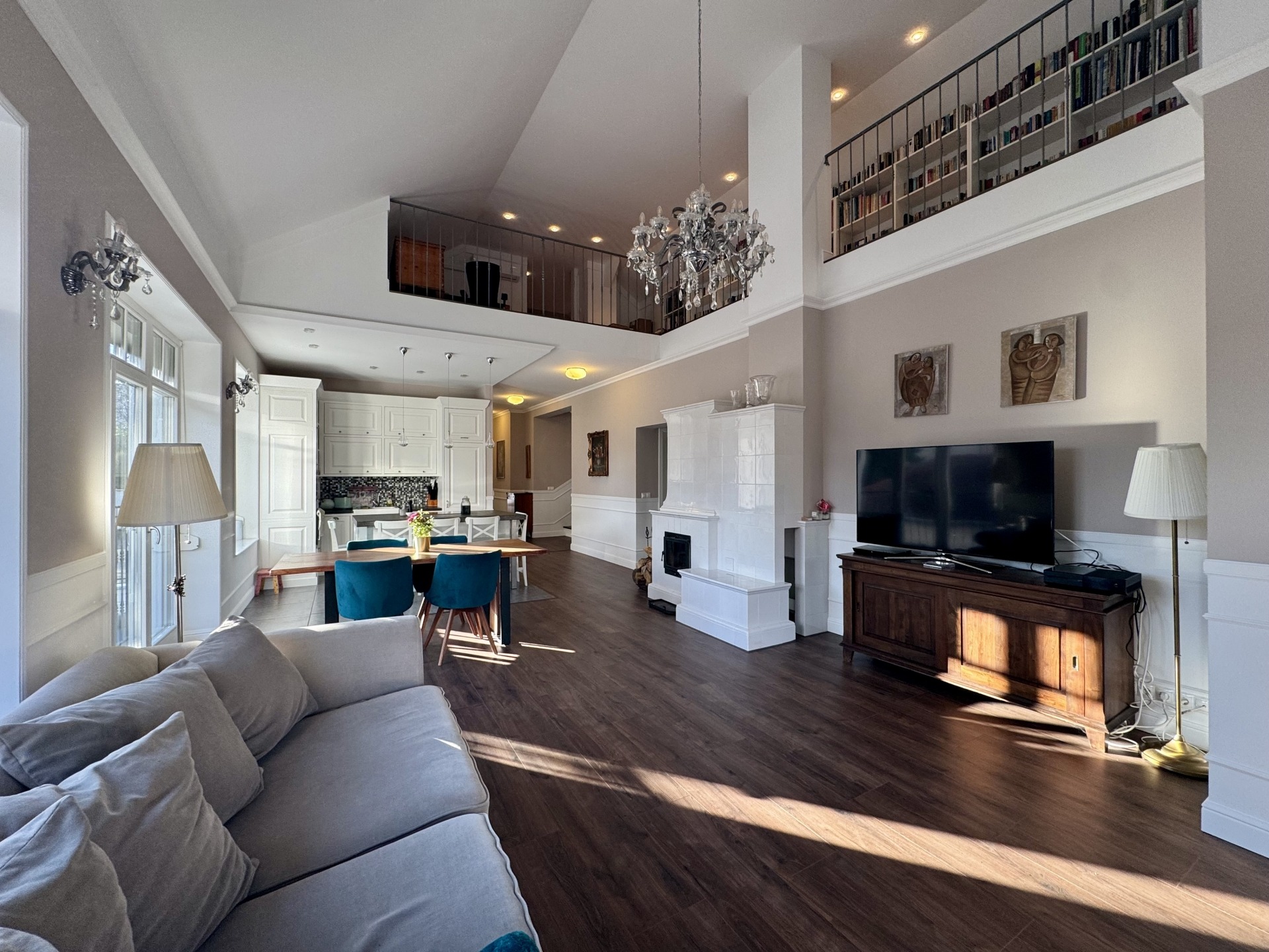 Amerikai konyhás, előkelő galériás nappali, ahol megtalálható egy pazar cserépkályha.