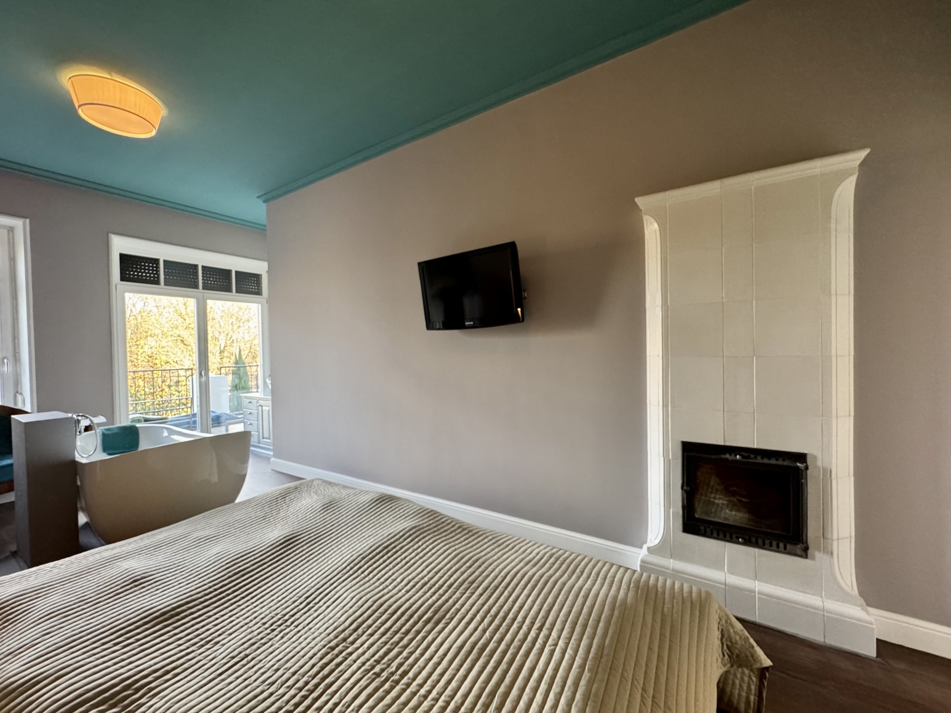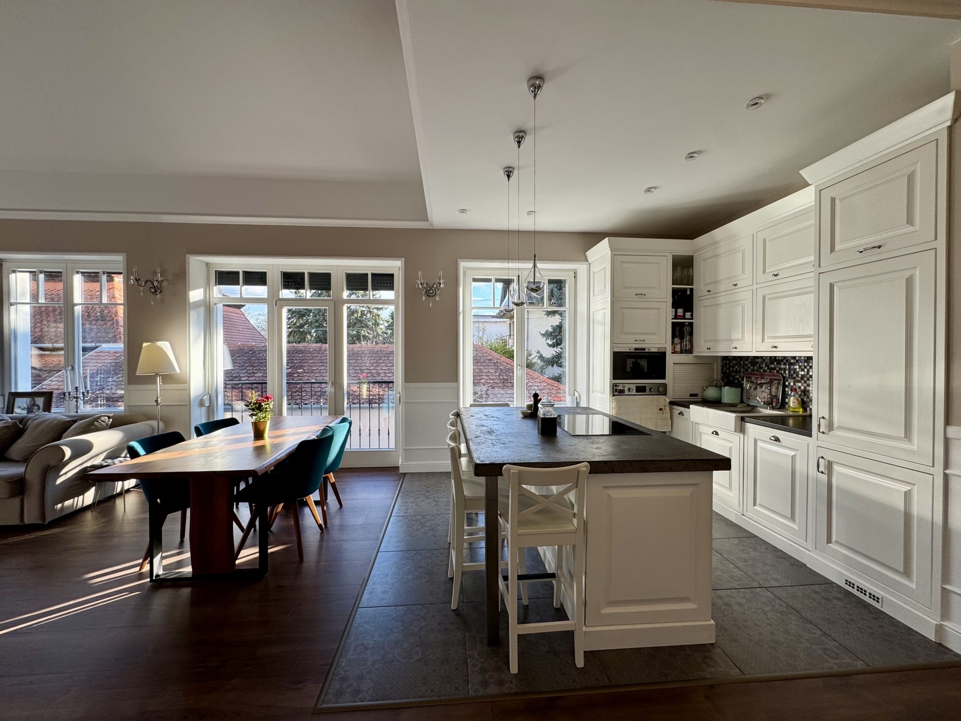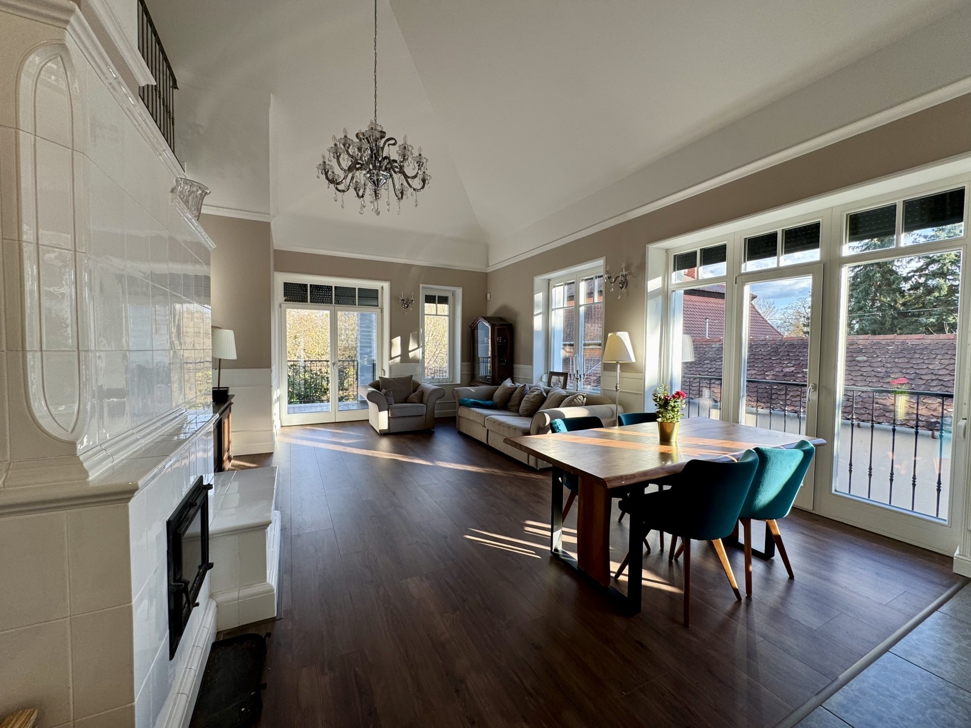 Amerikai konyhás, előkelő galériás nappali, ahol megtalálható egy pazar cserépkályha.