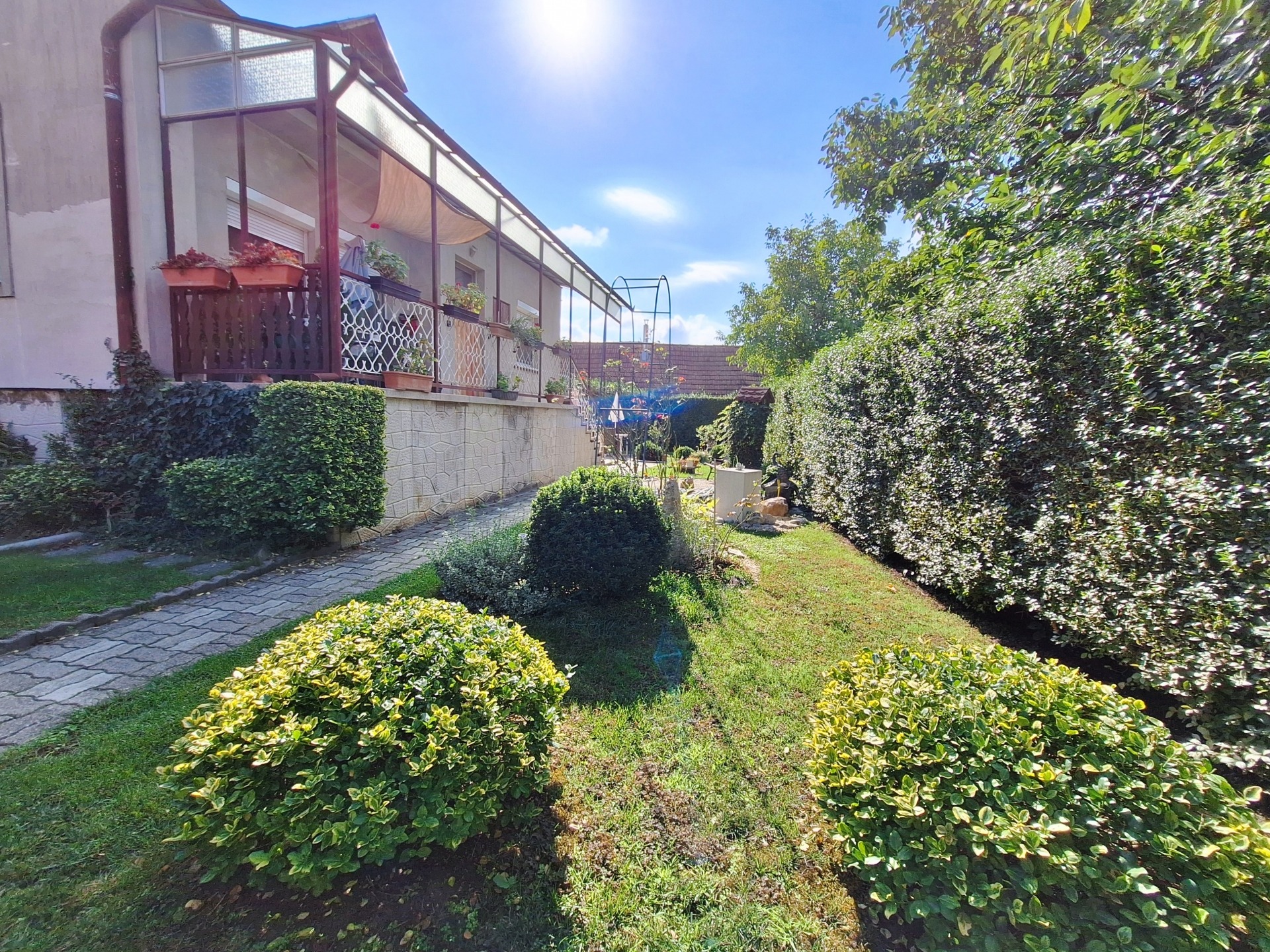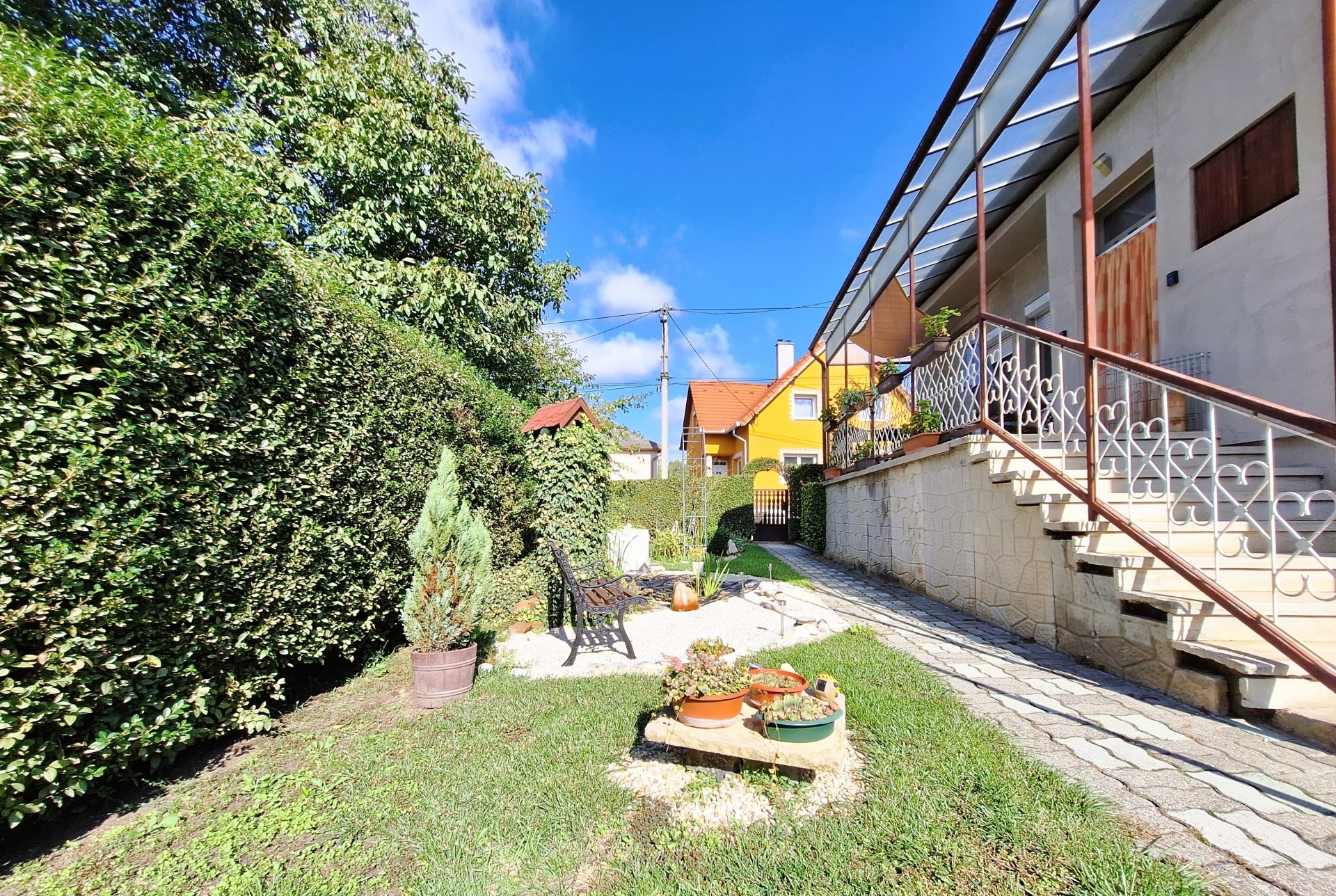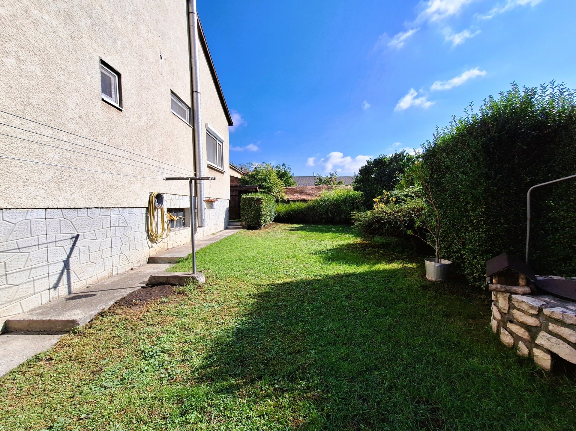 Az ingatlan egy 529 nm-es, körbekerített telken helyezkedik el, ahol gondozott, virágos kert, kerti sütögető és tároló található. A házhoz garázs és pince is tartozik, így minden adott a kényelmes, nyugodt élethez.