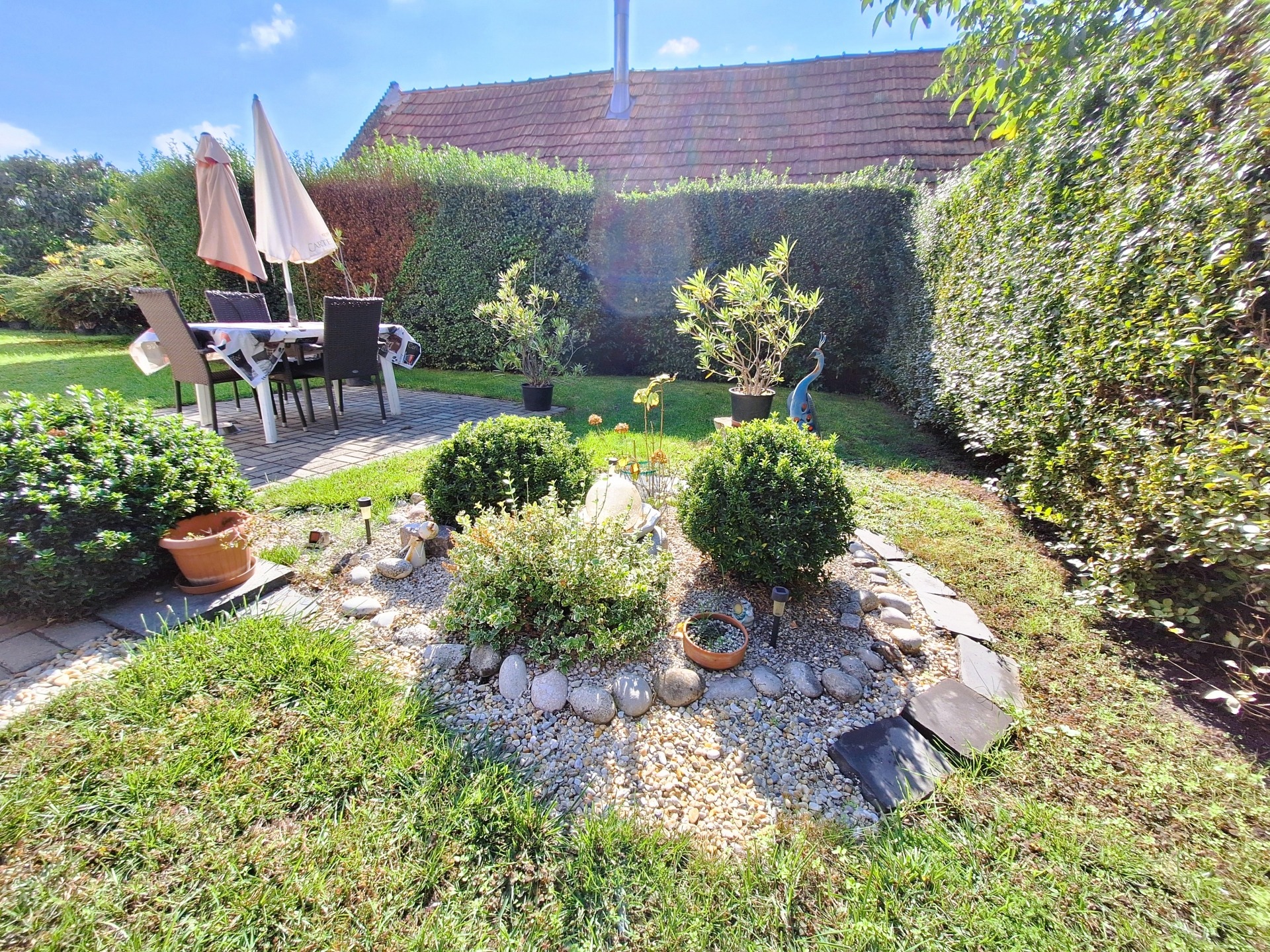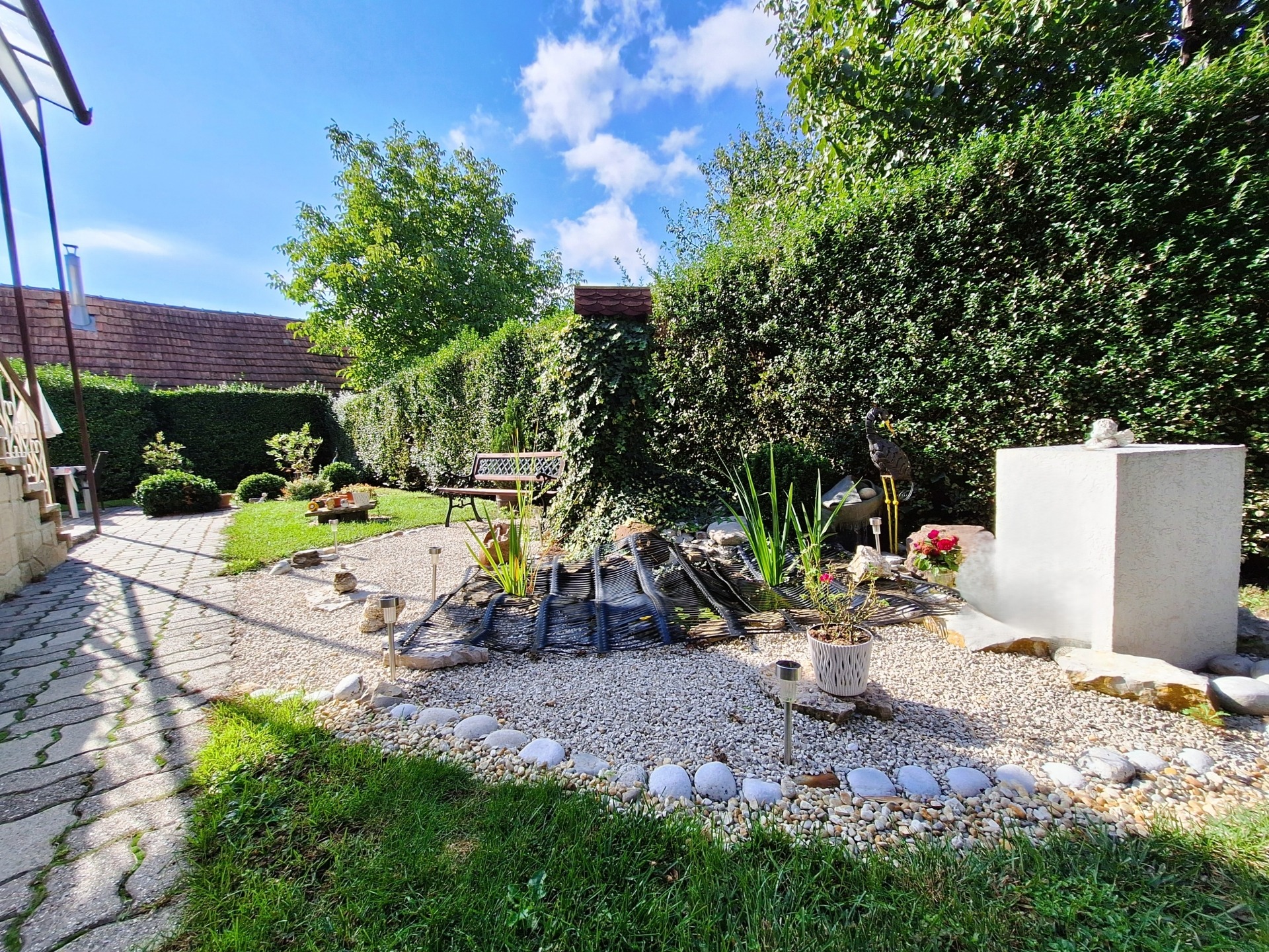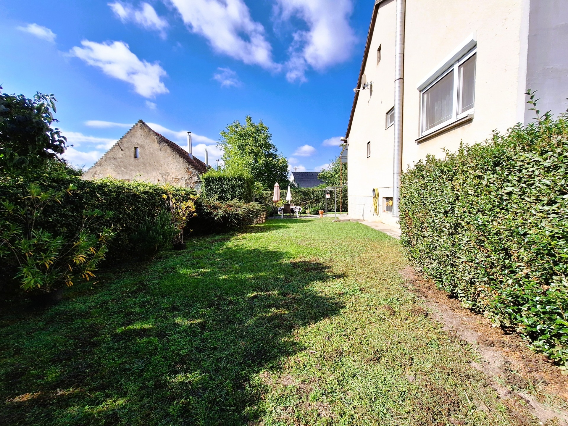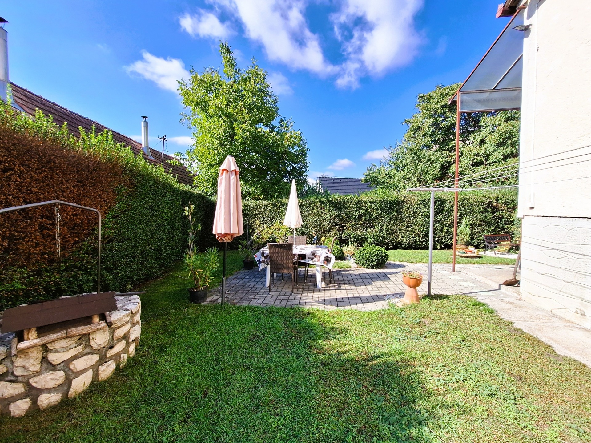 Az ingatlan egy 529 nm-es, körbekerített telken helyezkedik el, ahol gondozott, virágos kert, kerti sütögető és tároló található. A házhoz garázs és pince is tartozik, így minden adott a kényelmes, nyugodt élethez.
