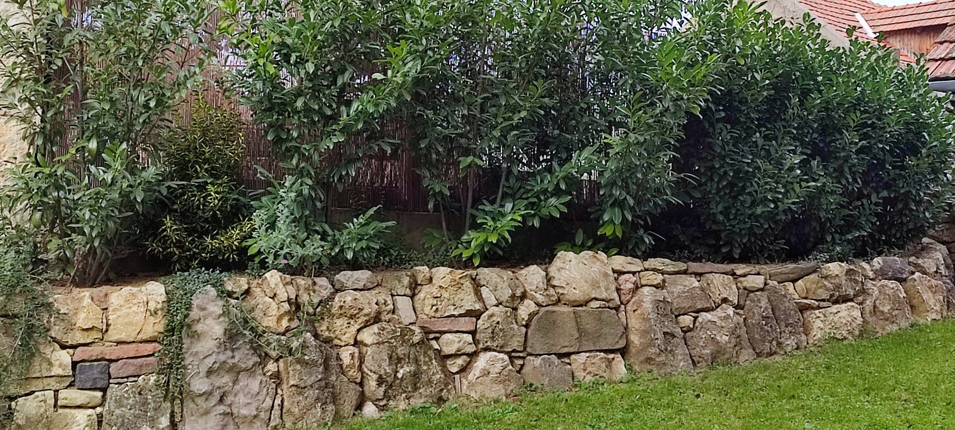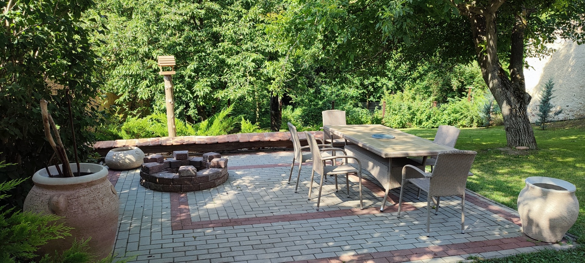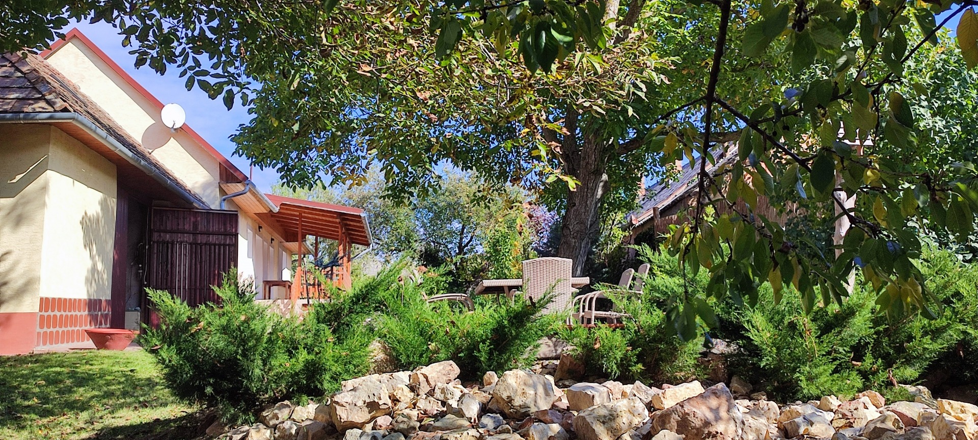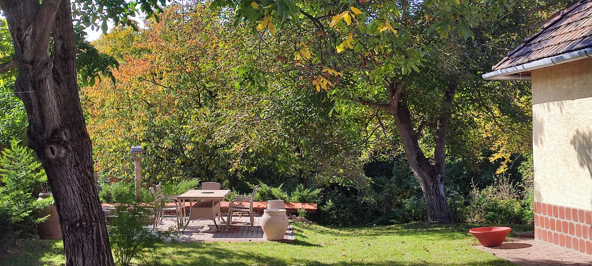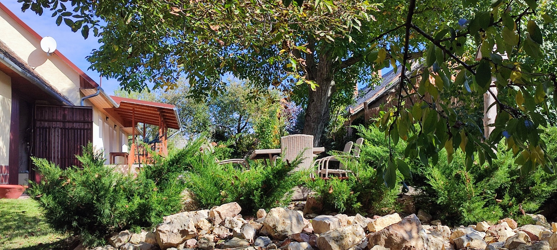 A kert romantikus, idilli hangulatú: árnyas fák, virágzó cserjék és évelők, kiülő, gyümölcsfák, valamint a csordogáló patak teszik minden évszakban szemetgyönyörködtető látvánnyá.
