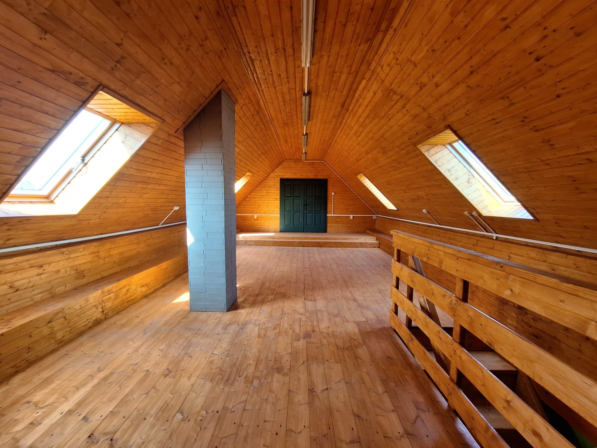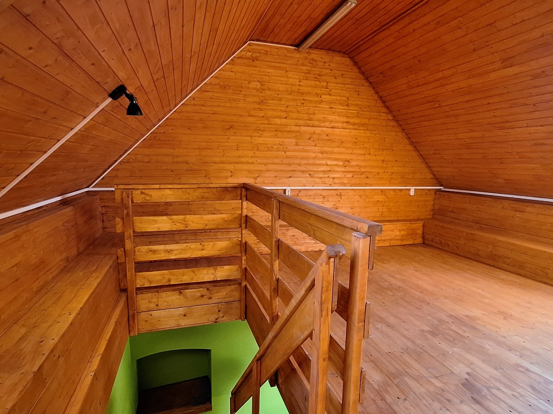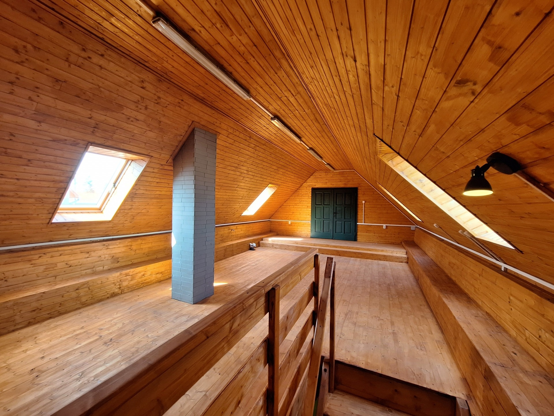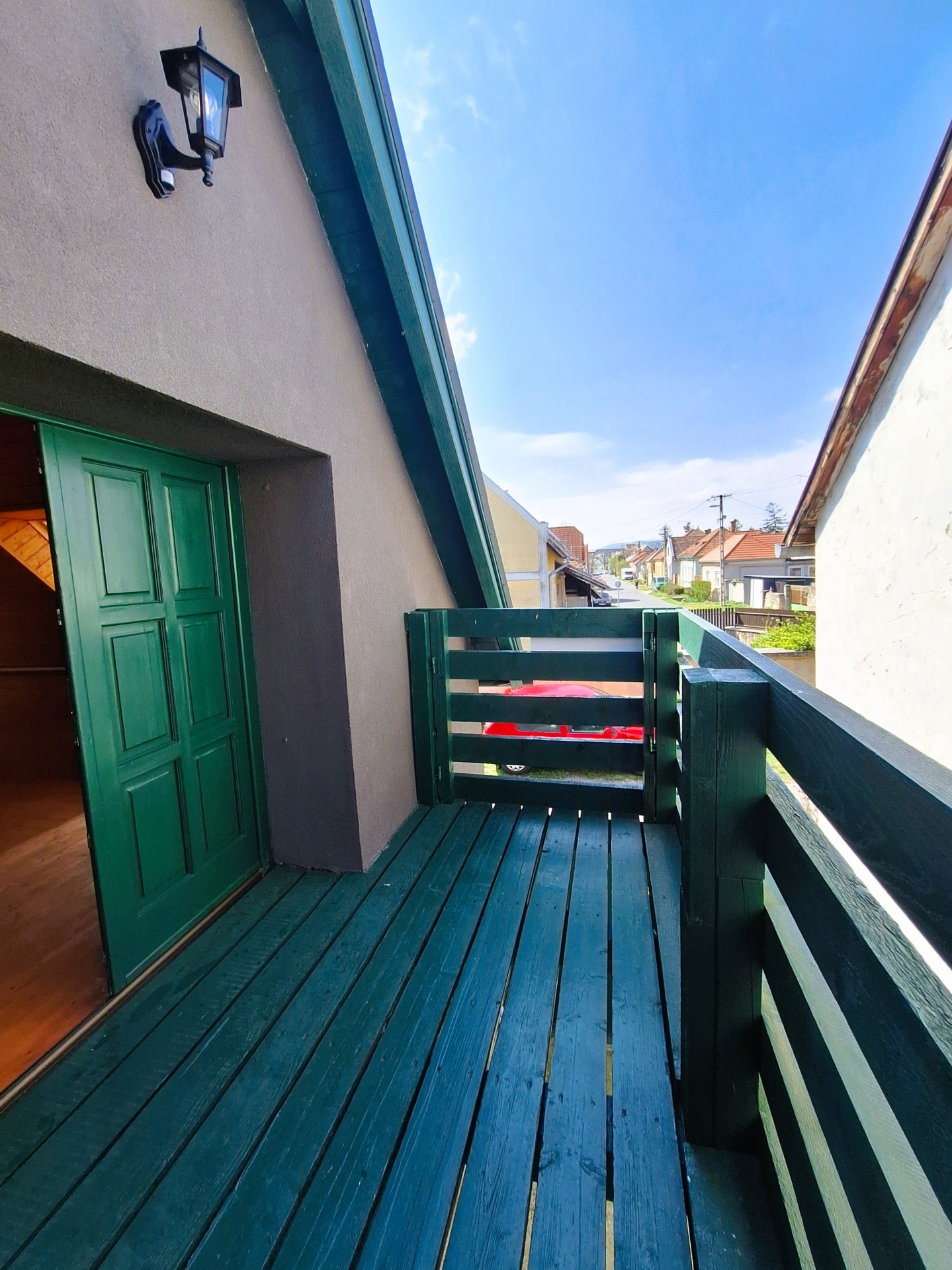 - A tetőtér jelenleg egy légterű, jól alakítható élettér: víz és csatorna felvezetve → mosdó/WC kialakítható. Innen egy kis erkély is nyílik.