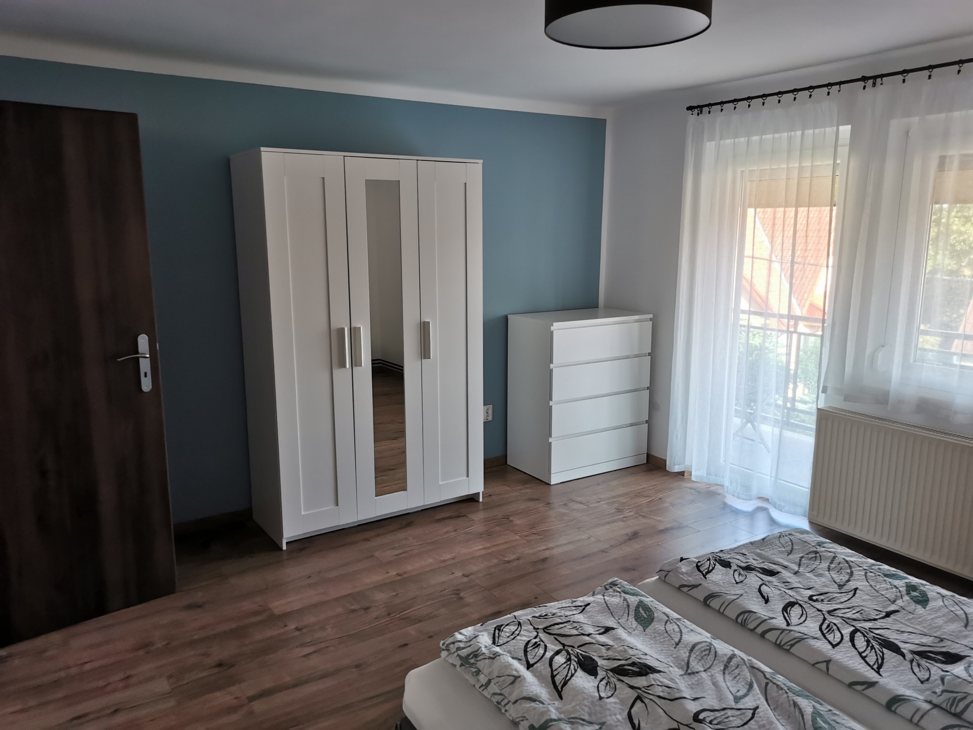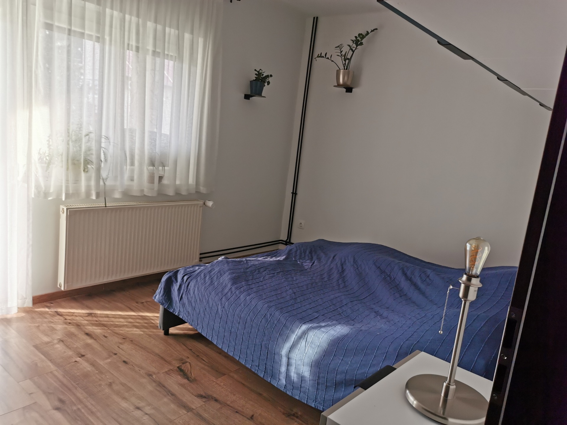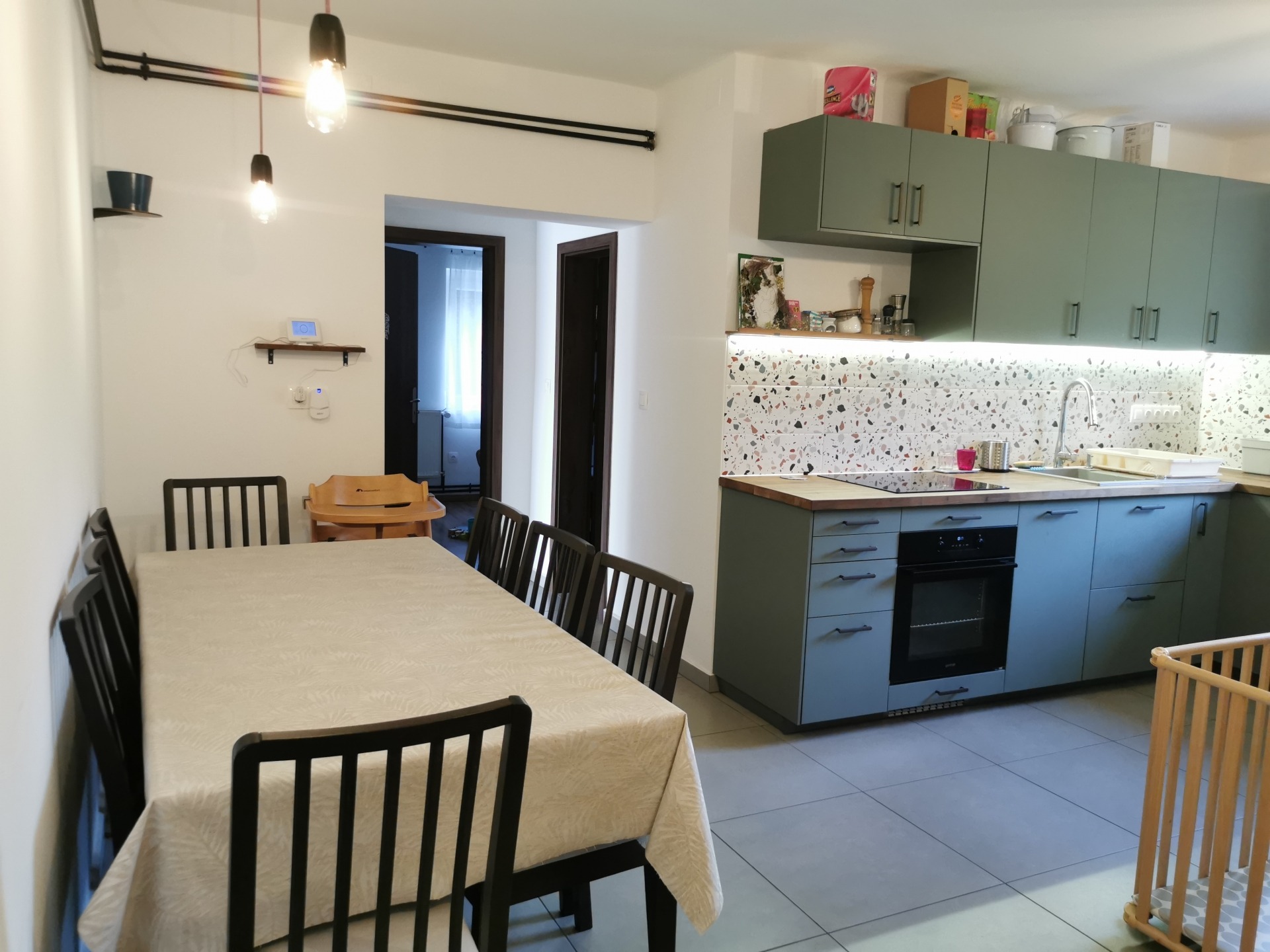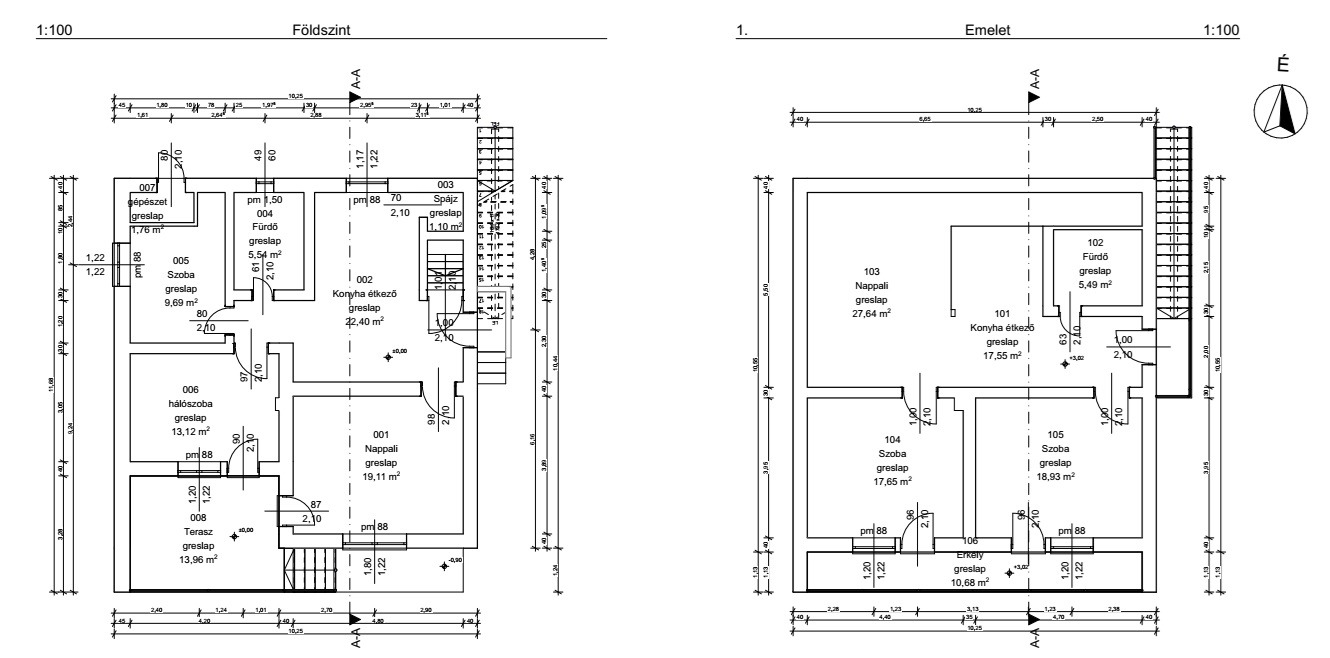 Emelet: Tágas konyha-étkező-nappali, 2 külön nyíló hálószoba és fürdő-wc.