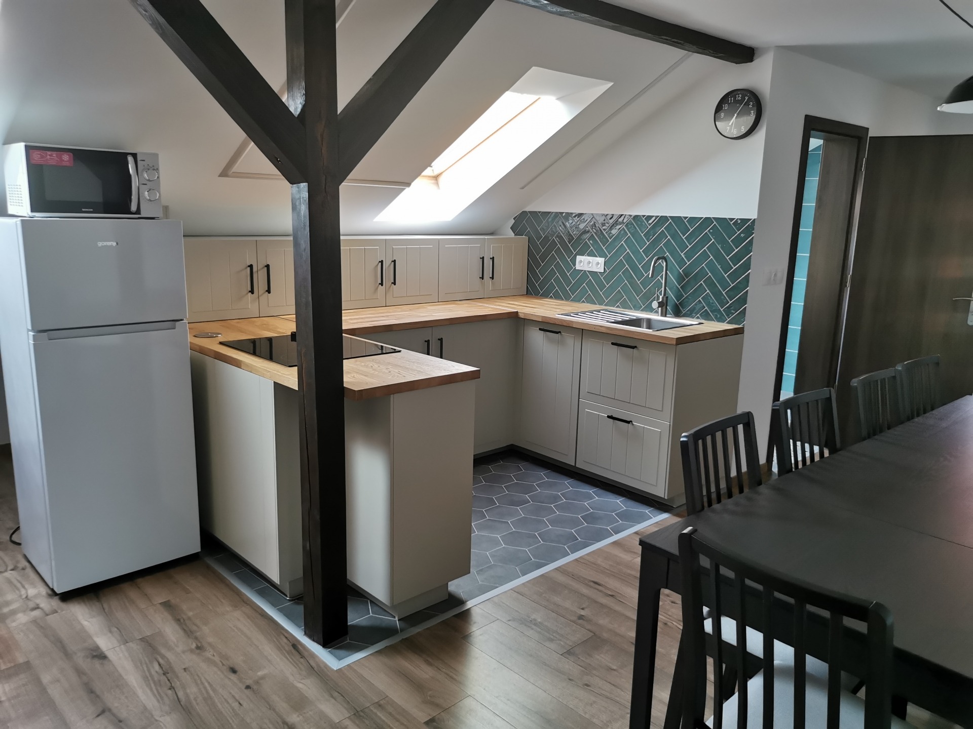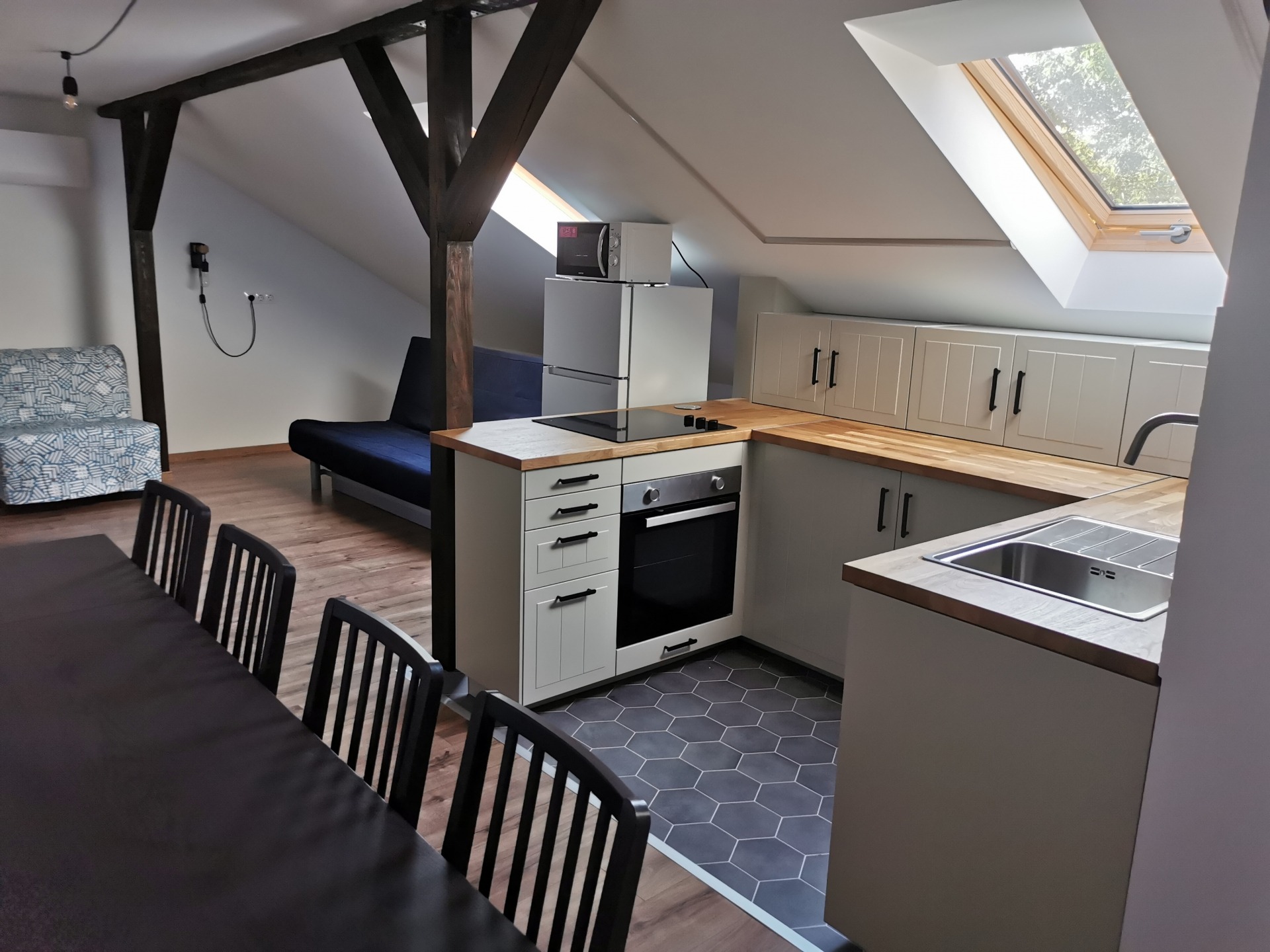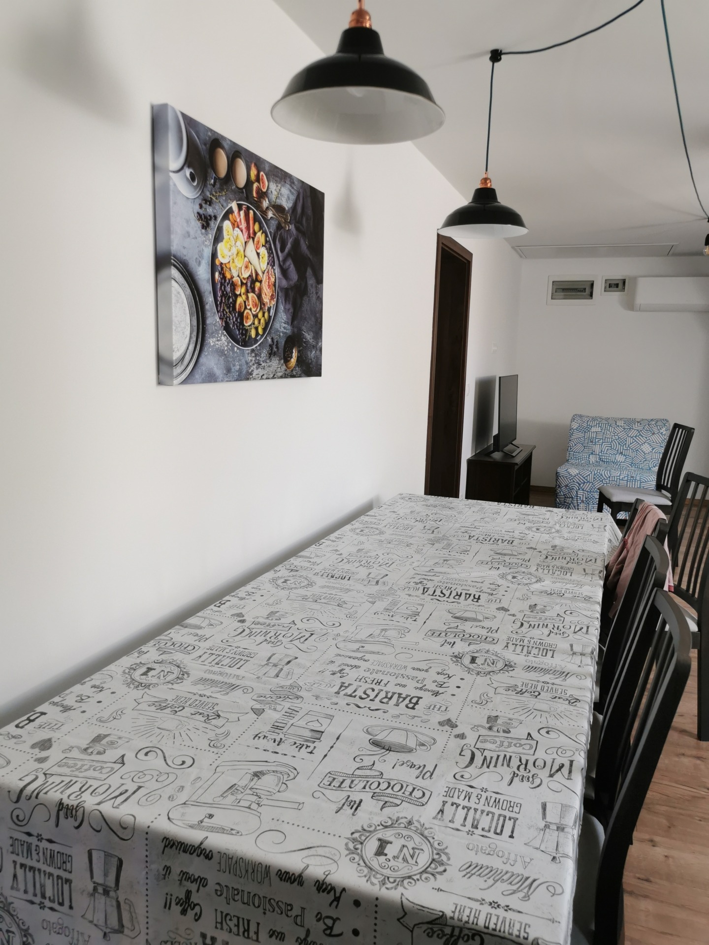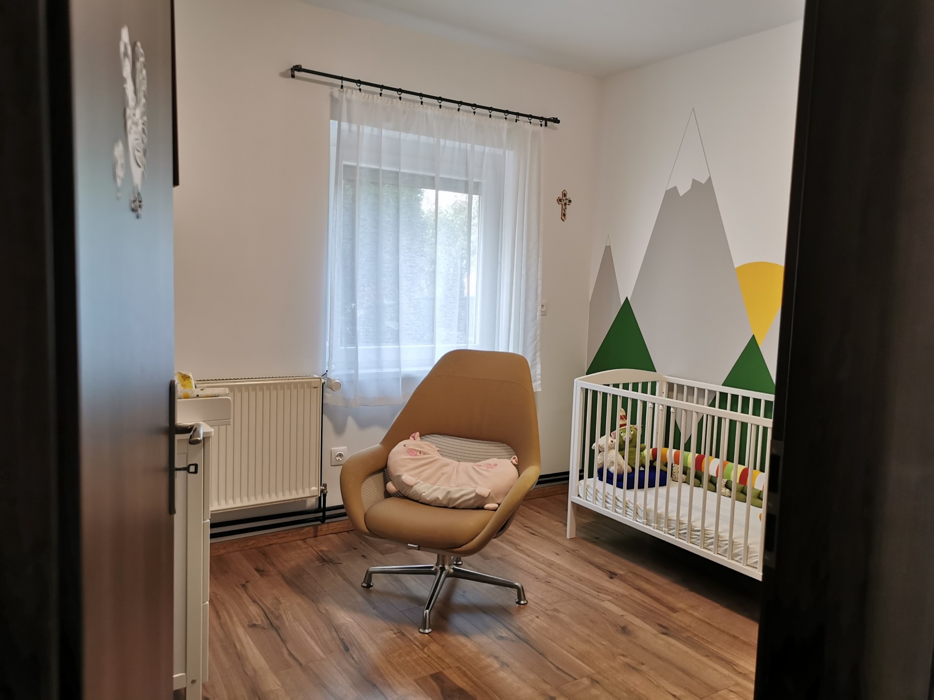Emelet: Tágas konyha-étkező-nappali, 2 külön nyíló hálószoba és fürdő-wc.