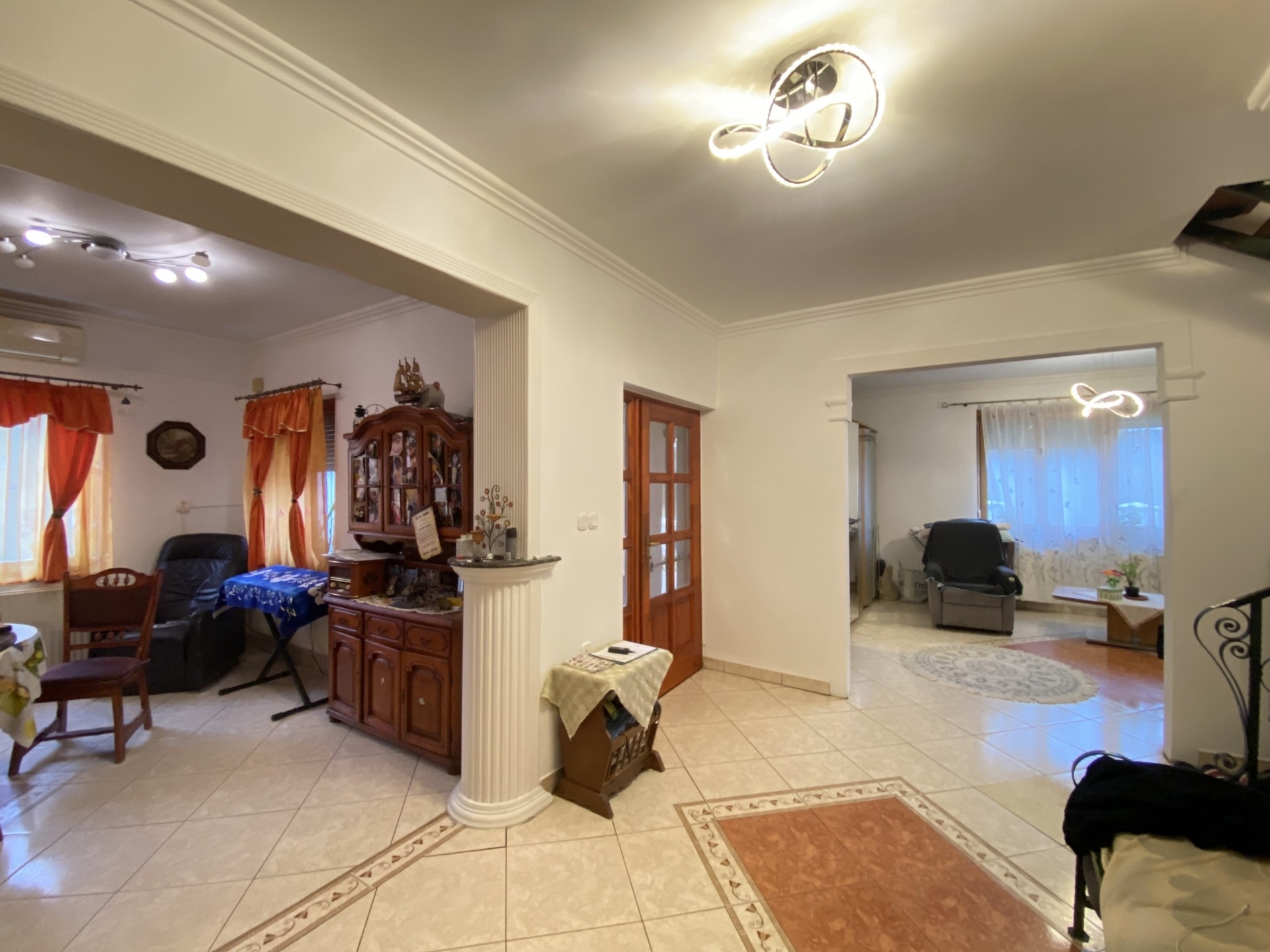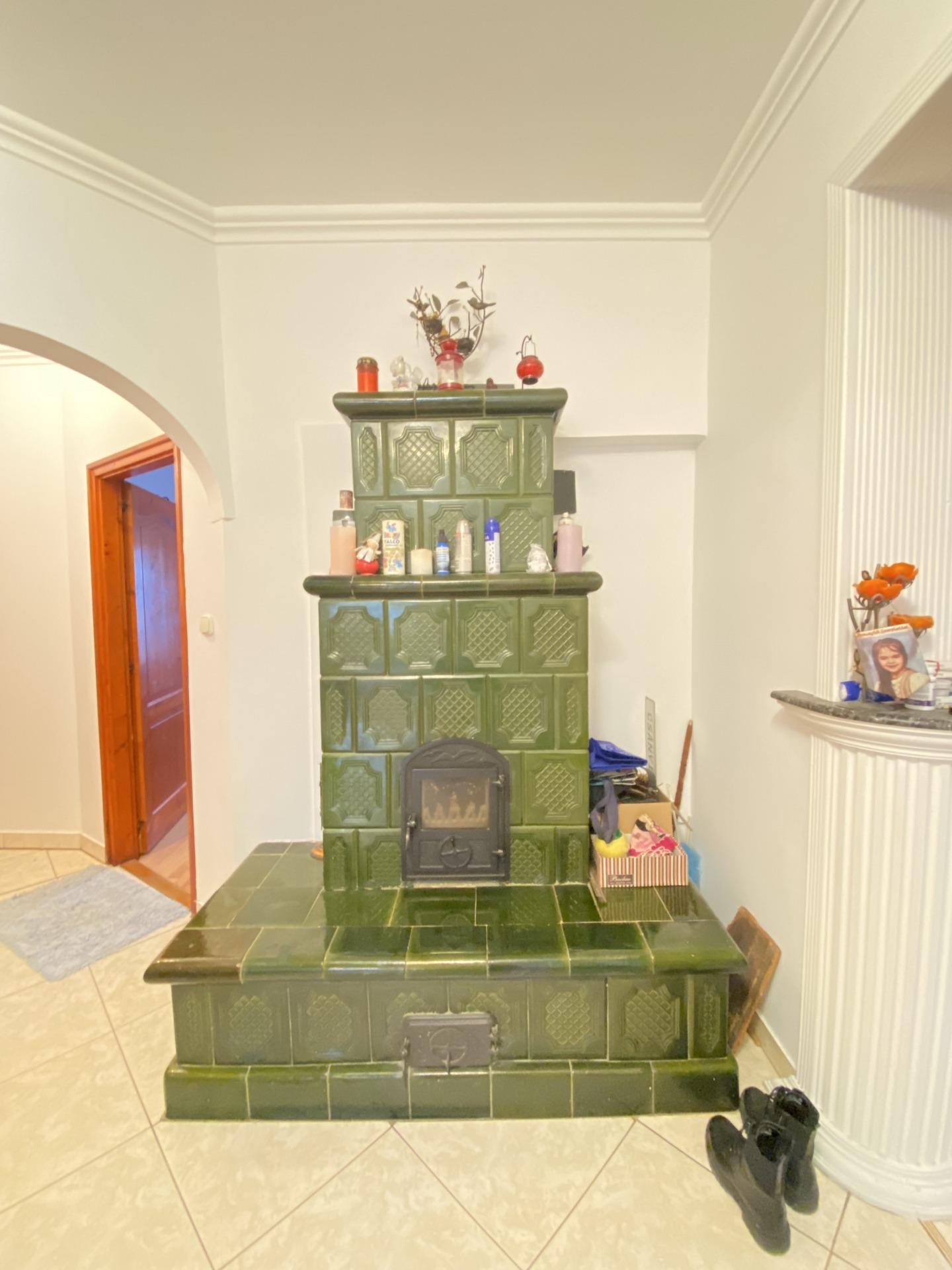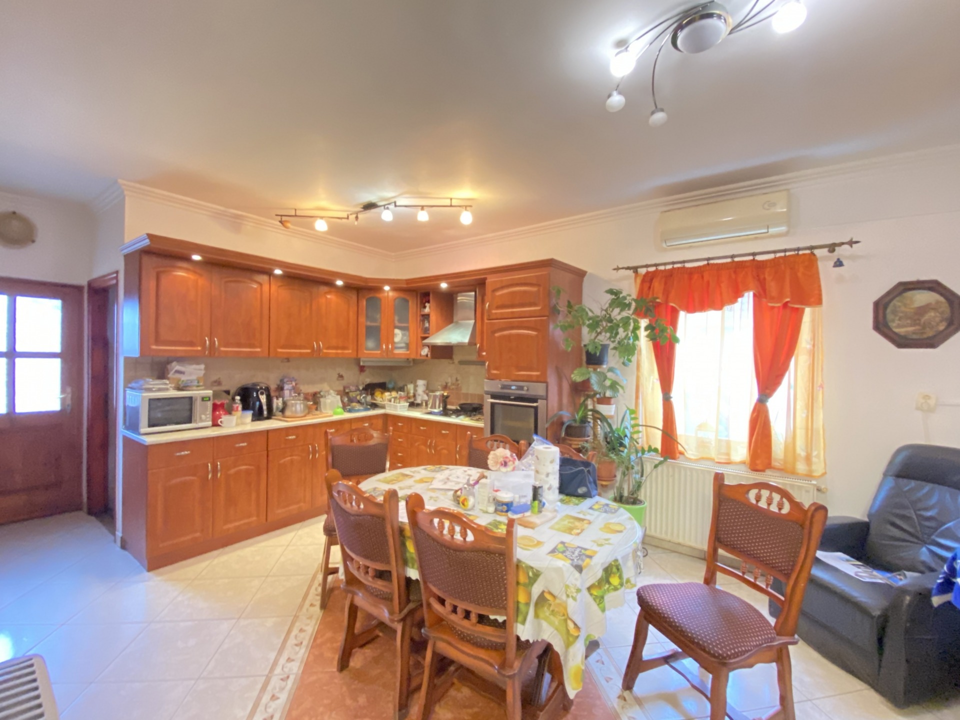 Heating is provided by a solid-fuel boiler and a beautiful tiled stove. A gas connection is available on the property, making gas heating possible if required. The pleasant temperature of the kitchen is ensured by air conditioning.